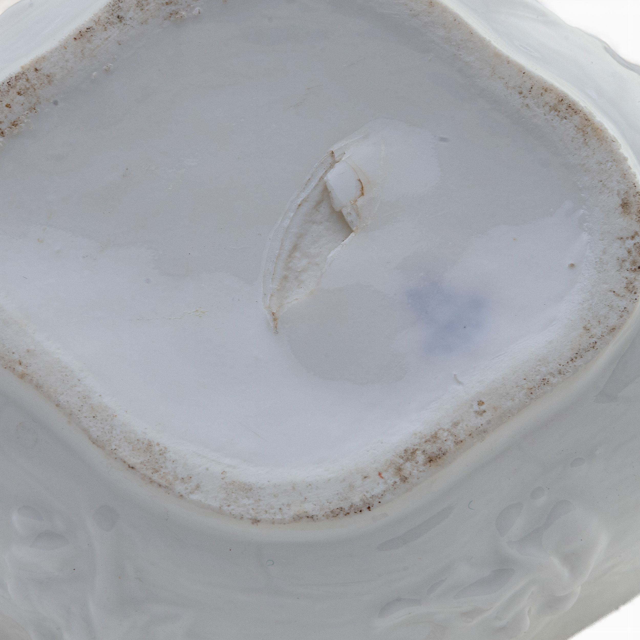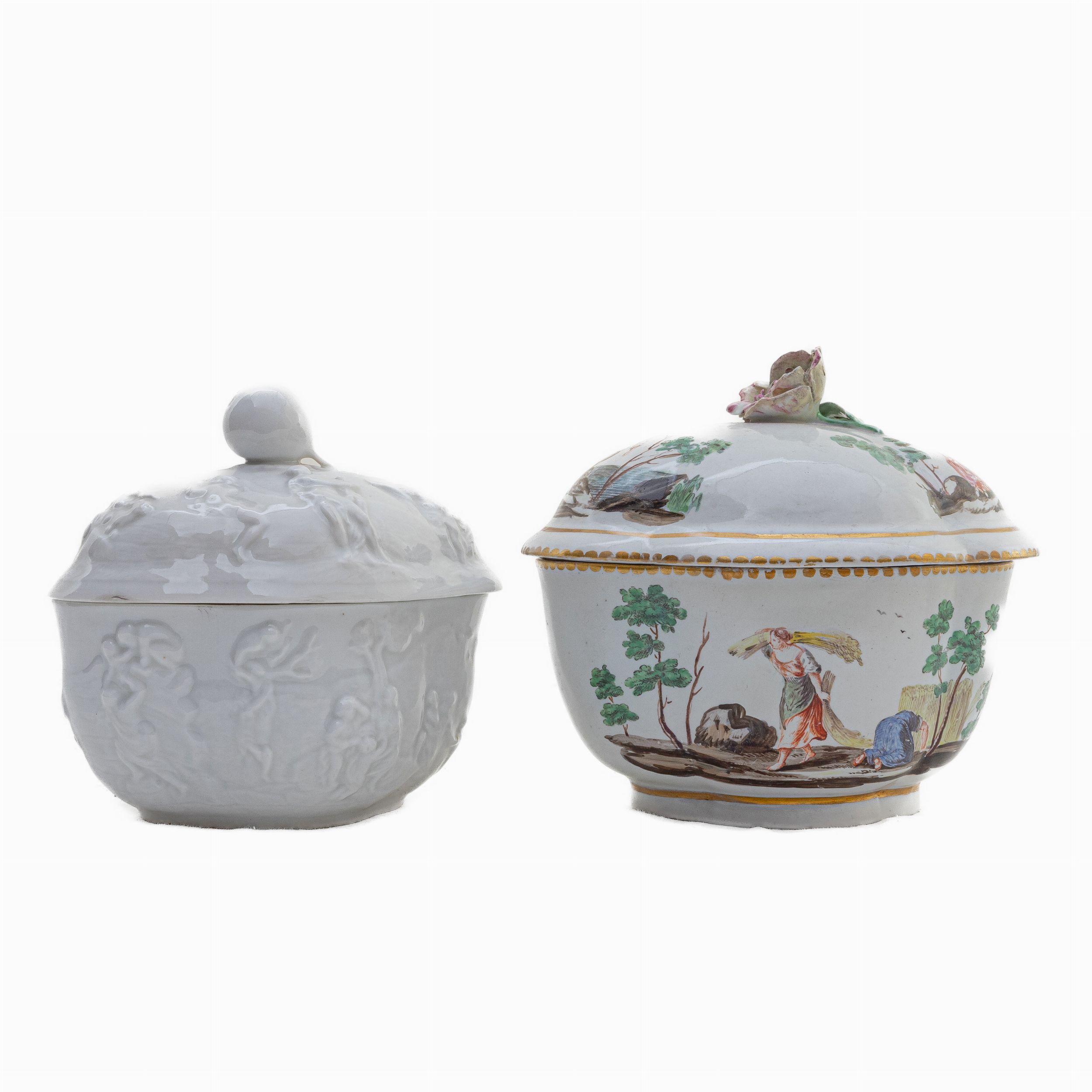 11 x 7 x 6 cm; 10 x 7 x 6 cm di forma ovale con corpo costolato, una in monocromo con decoro a bassorilievo istoriato timbrata con 'n ' coronata in blu sotto smalto ; l'altra con decoro ad isole con scorci di paesaggio e personaggi. Manifattura di Ginori Doccia, seconda metà XIX secolo.