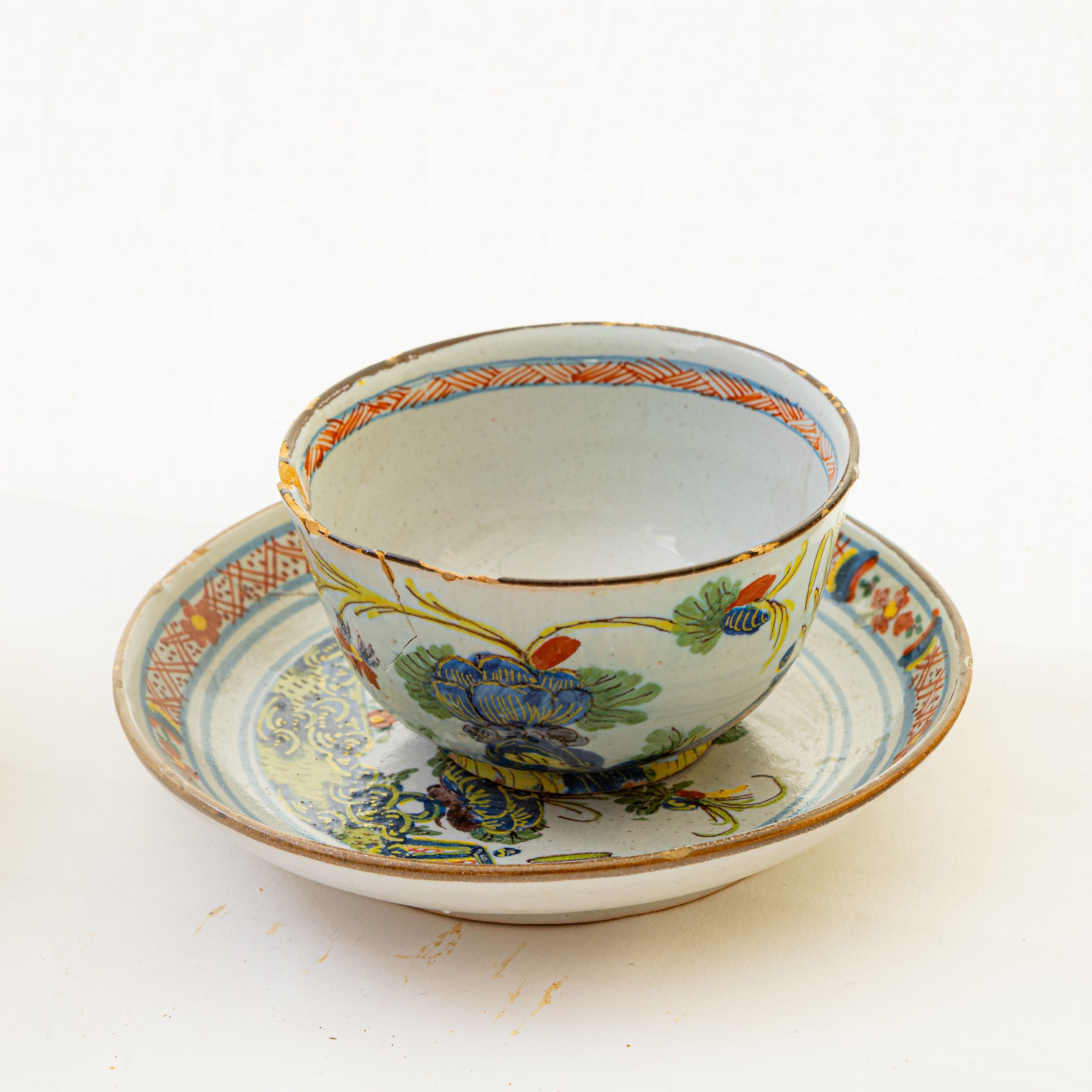 Lotto di due tazze da caffè con piatto in ceramica policroma :