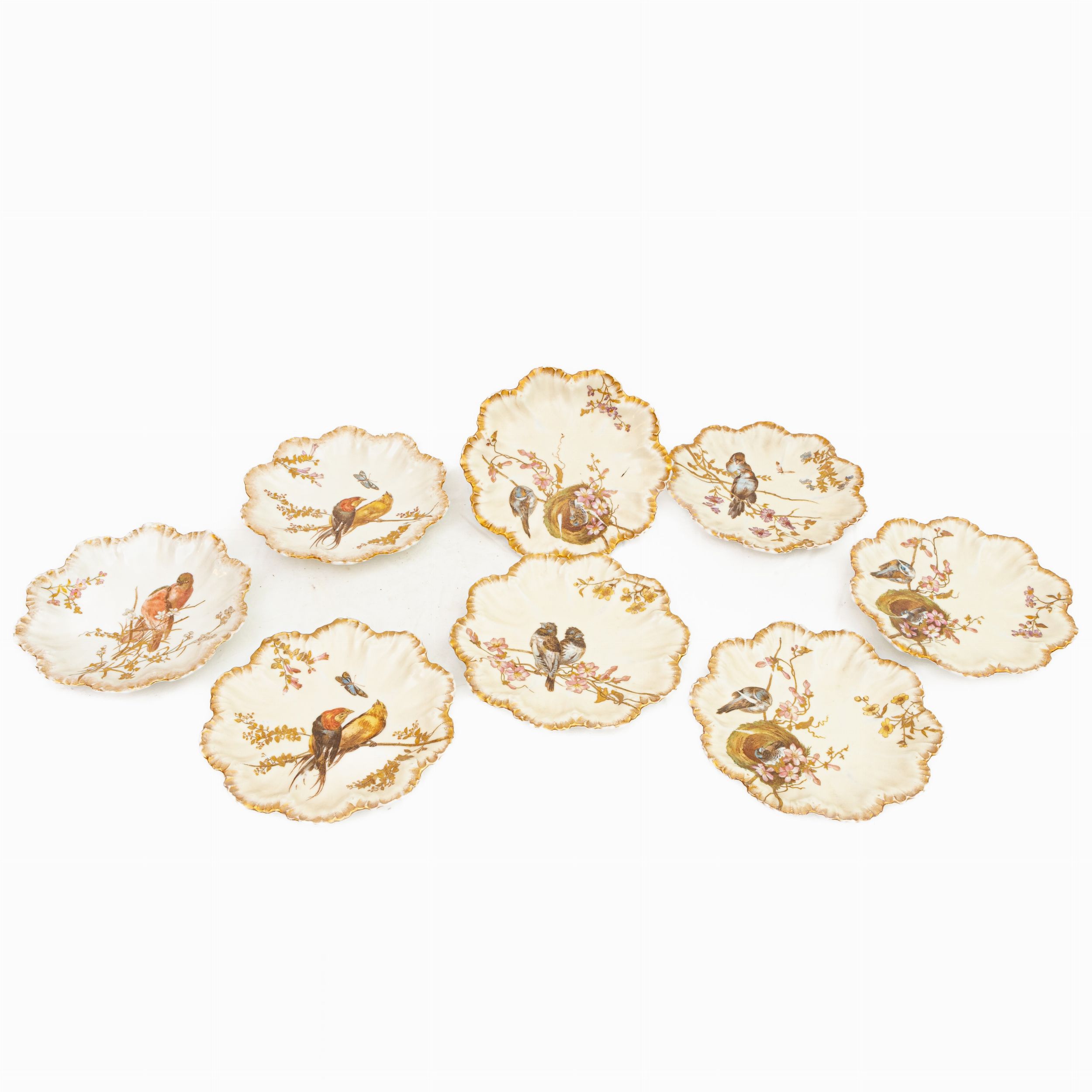 Lotto di otto piatti in porcellana policroma con decoro floreale ed animale