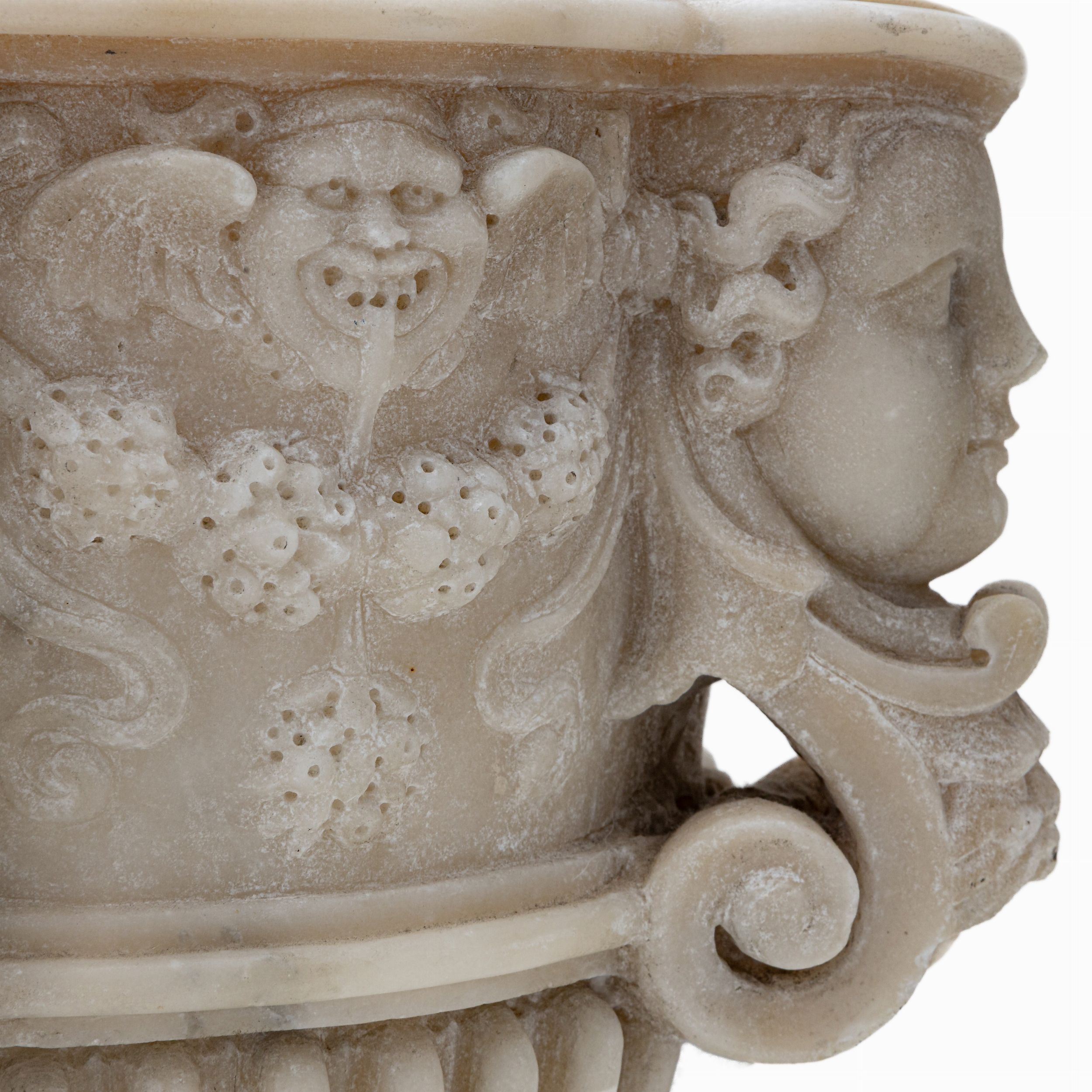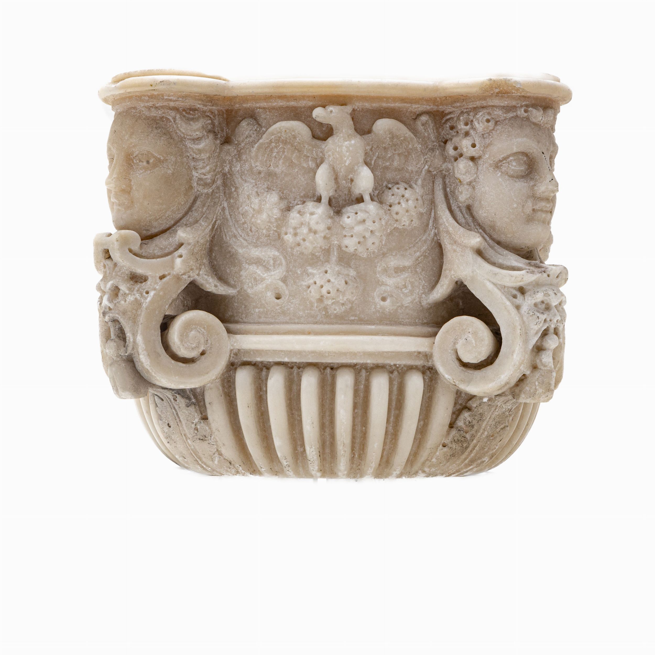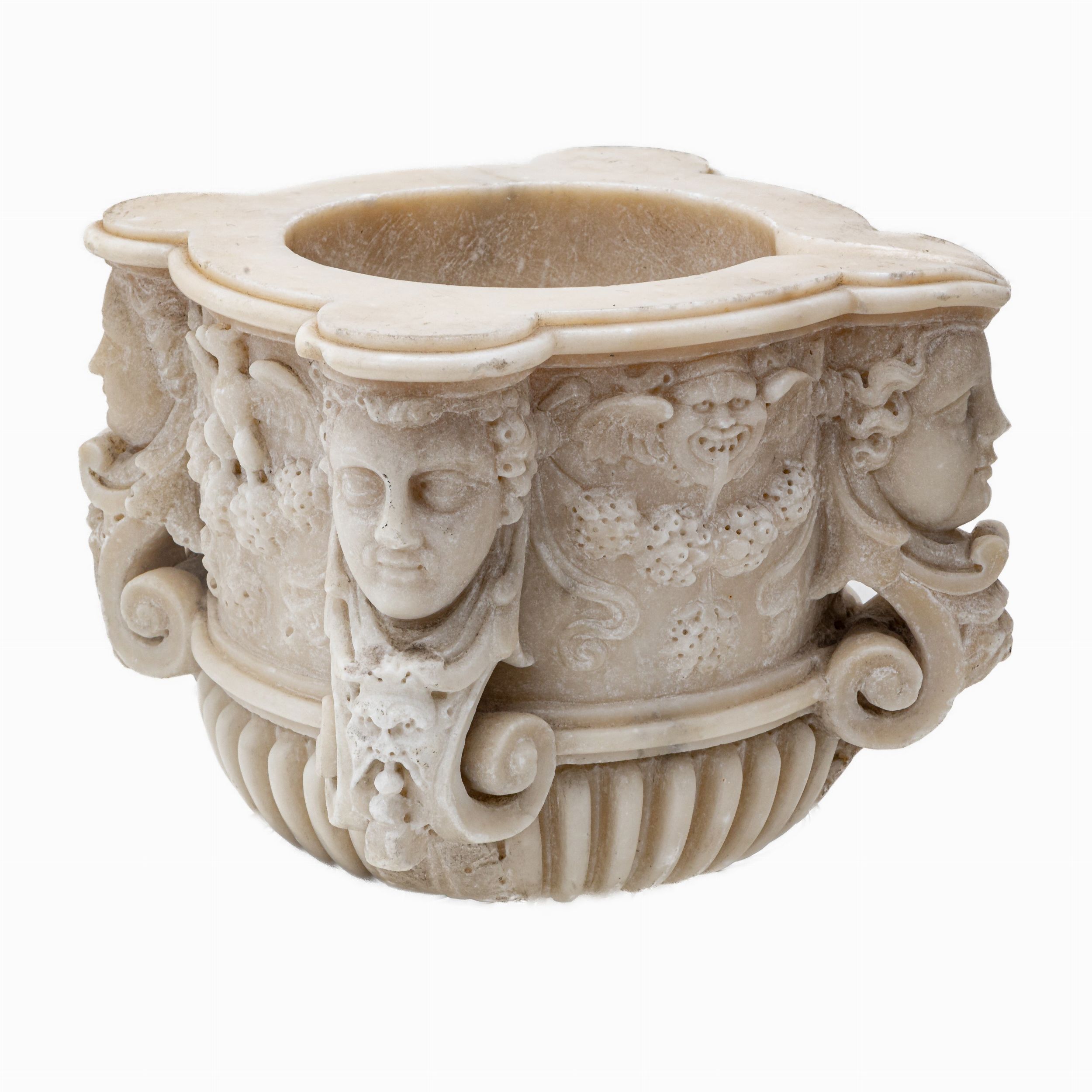 fine XIX inizi XX secolo di forma quadrangolare. Con quattro teste mulieri angolari intervallate da sculture di teste di angeli con motivi floreali.  Base del corpo costolata.
