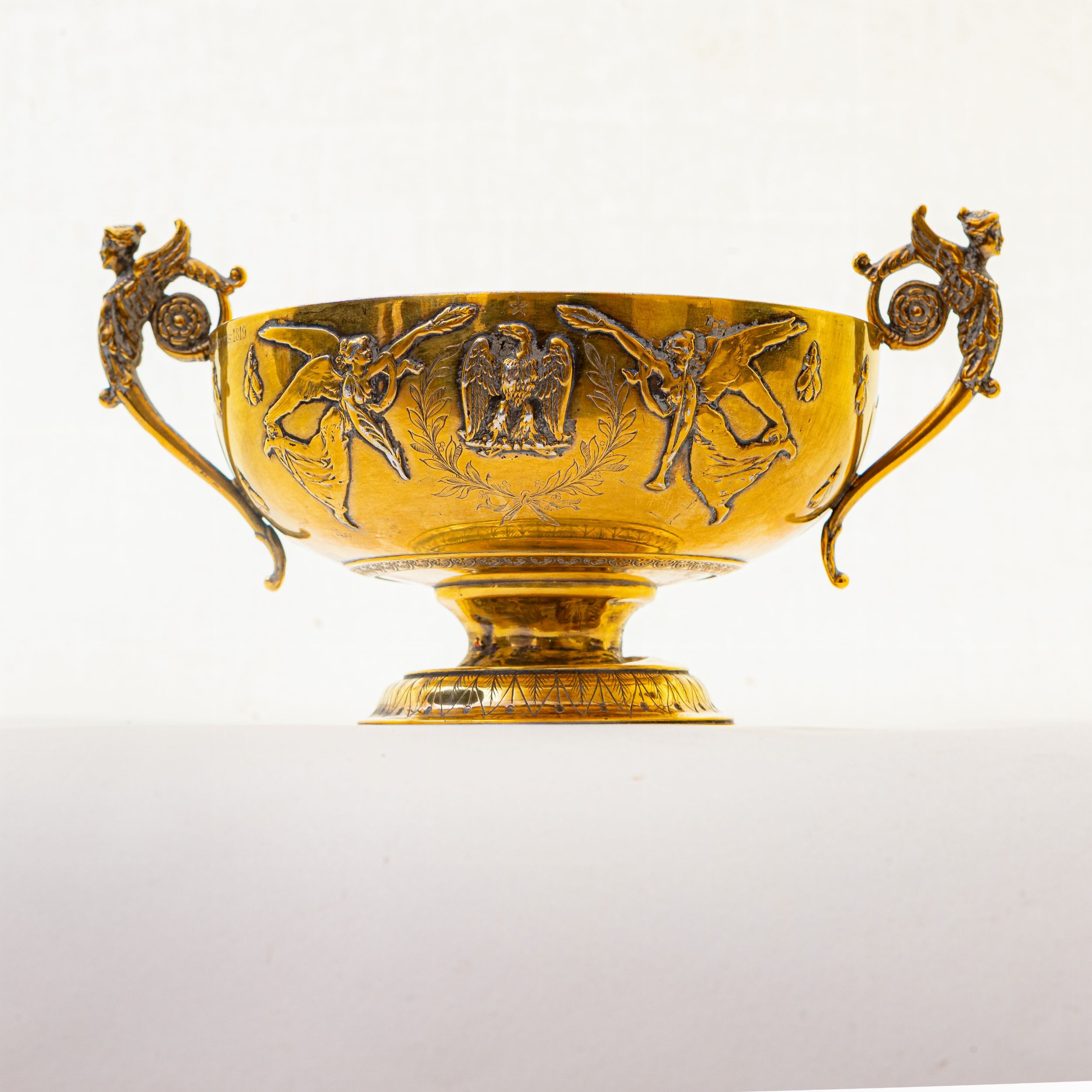 primo quarto XIX secolo medico capo dell'Armata francese in Oriente e primo medico della guardia Imperiale napoleonica durante i Cento Giorni, nel 1819 , anno inciso sulla coppa, viene nominato comandante della Legion d'Onore e il suo nome viene inciso su questa coppa. Alla base della stessa come fondo del bacino è posta la medaglia in argento coniata nel 1809 per ricordare la costituzione delle provincie Illiriche da parte di Napoleone. Diametro della medaglia 40,4 - 40,7 mm circa, contorno a cornice con al dritto NAPOLEON EMP - ET ROY con testa laureata a destra e sul taglio del collo ANDRIEU F. Al verso giovenca che allatta il vitello sormontata da clava ed in esergo: CONQUETE DE L'ILLYRIE = M. DCCCIX , in basso gli incisori DE PAULIS F DENON D . La coppa presenta le prese a virgola con testa di arpie, lungo il bordo vittorie alate ed api insieme ad aquila Imperiale in rilievo. Incise lungo il corpo '1804 . 1814 epopea militare'. Il piede ad anello è decorato con palmette incise. Gr. 326 Condizioni: difetti al collo del piede, medaglia usure come da utilizzo nel tempo.