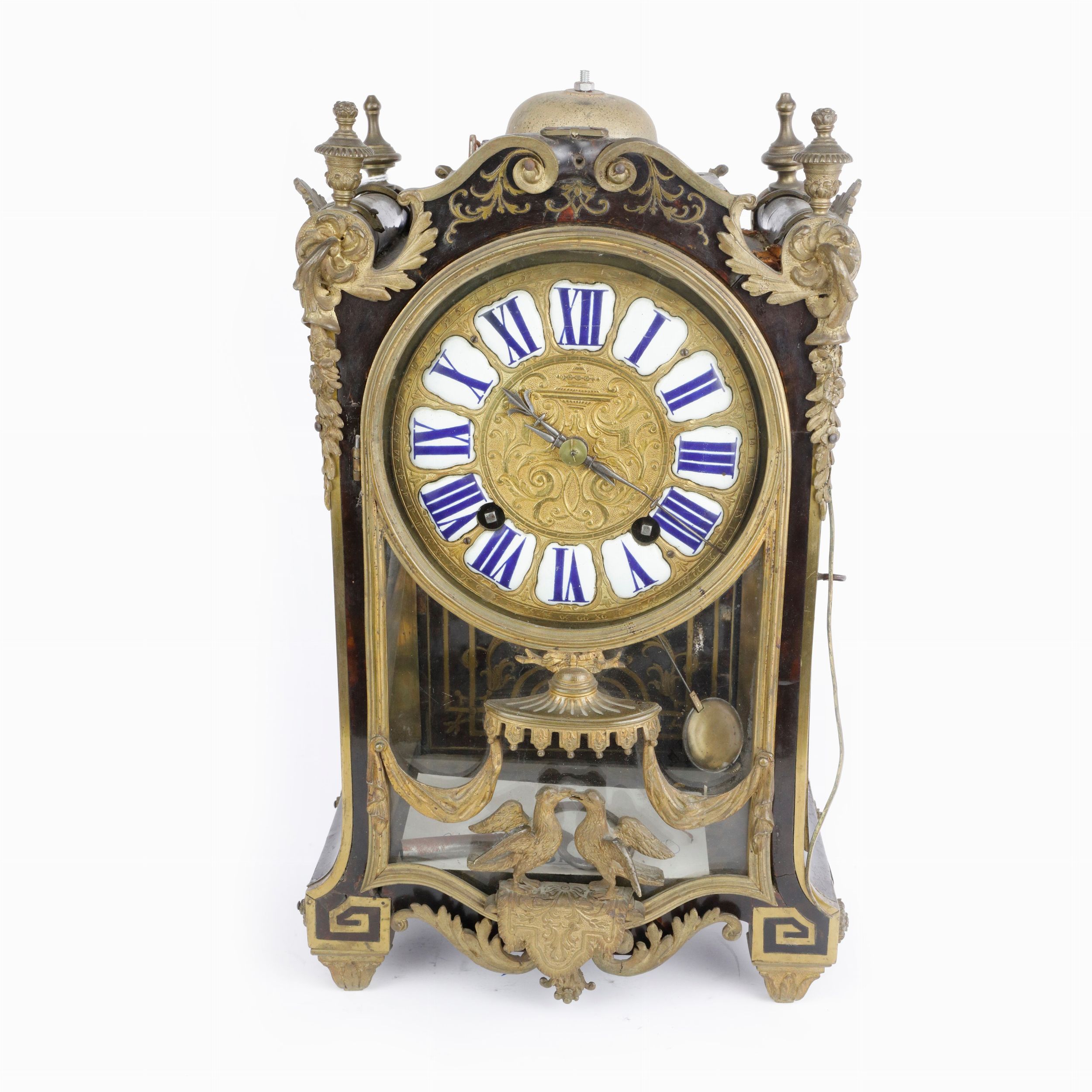 35 x 22 x 12 cm XVIII secolo con quadrante circolare in bronzo dorato ed inciso a rilievi floreali, con numeri romani in blu su smalto bianco e numeri arabi sul bordo esterno, presenta due fori per la carica e la suoneria. Movimento con sospensione a filo e regolatore a pendolo ; suoneria a percussione con campana in bronzo, macchina firmata Gite Martinot aparis. Cassa a plinto su quattro piedi tronco conici , con pareti laterali in vetro e legno impiallacciato e filettato in ottone. Condizioni: macchina non testata, piccole mancanze e difetti all'ebanisteria.