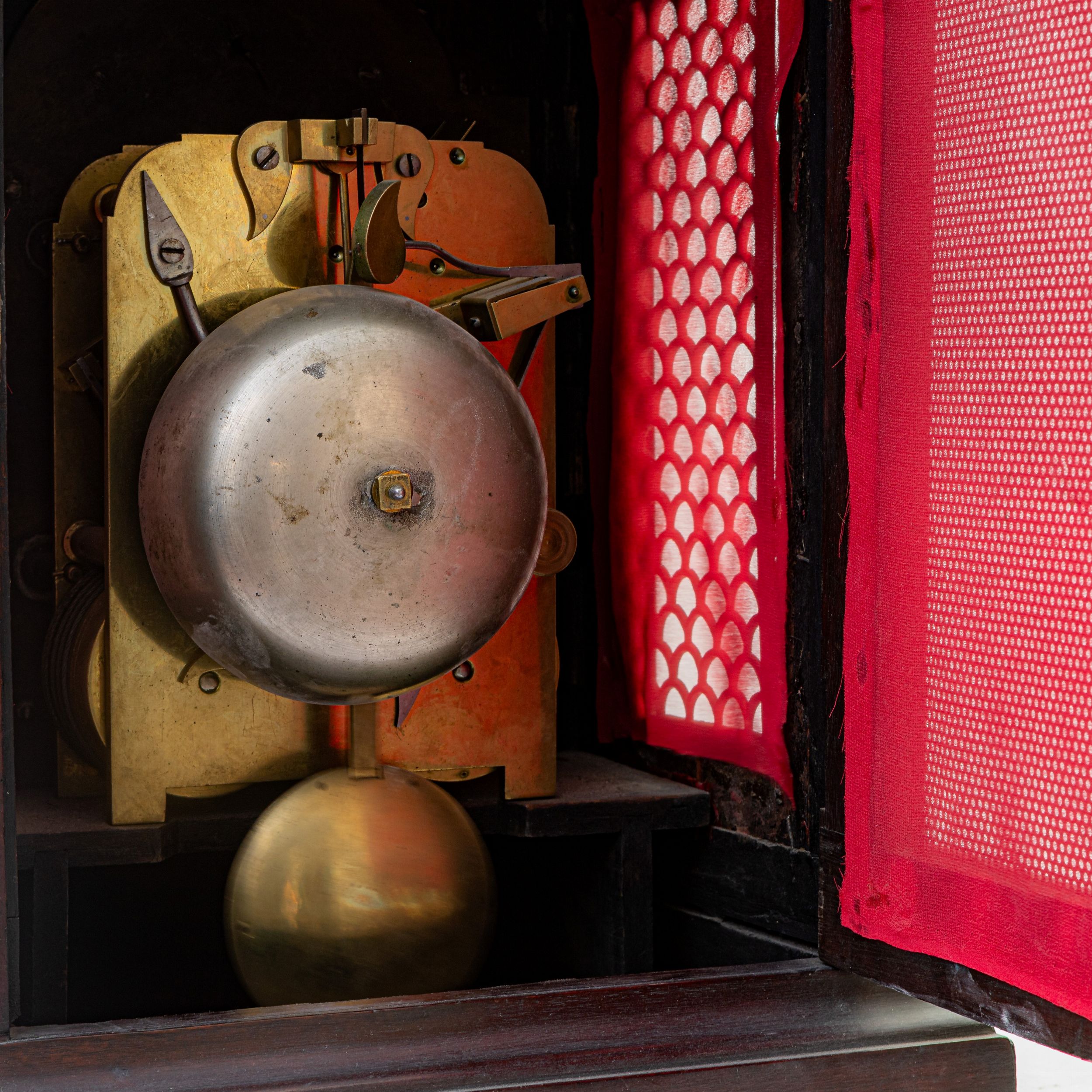 50 x 30 x 24 cm fine XIX inizi XX secolo cassa in legno, dalla linea frontale rettangolare con arco spezzato, fianchi laterali e posteriore a graticcio in ottone. Quattro piedi da appoggio a mensola e maniglia da trasporto. Quadrante in metallo argentato e bronzo dorato di forma circolare, con due fori per la carica delle ore e della suoneria, con doppia numerazione a caratteri romani ed arabi. Lancette in metallo traforato, con suoneria a martello su campana in bronzo. Meccanismo con sospensione a lamina d'acciaio e regolatore a pendolo. Macchina non testata, lamina della sospensione rotta.