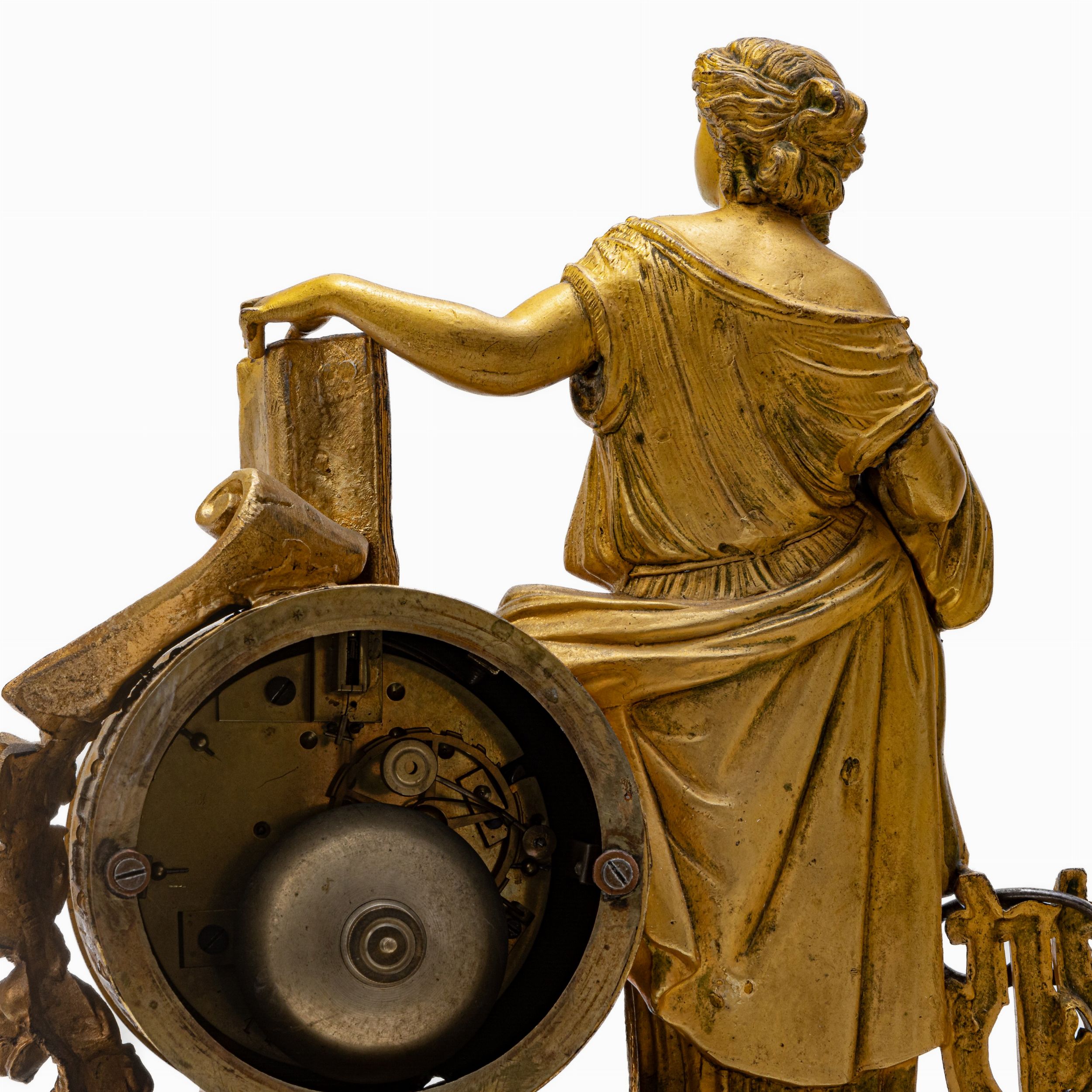 30 x 30 x 14 cm con base in marmo bianco, dal corpo cilindrico con accostata la musa Calliope in bronzo dorato. Macchina con quadrante rotondo a smalto bianco con numeri romani e due fori per la carica e la suoneria. Regolatore a pendolo con campana in bronzo per i rintocchi. Macchina firmata Japy Frerees 1855. Questa manifattura di orologi fu fondata negli anni 70 del settecento da Frederic Japy Beaucourt e rimase attiva sino alla fine anni 70 del ventesimo secolo. Macchina marciante.