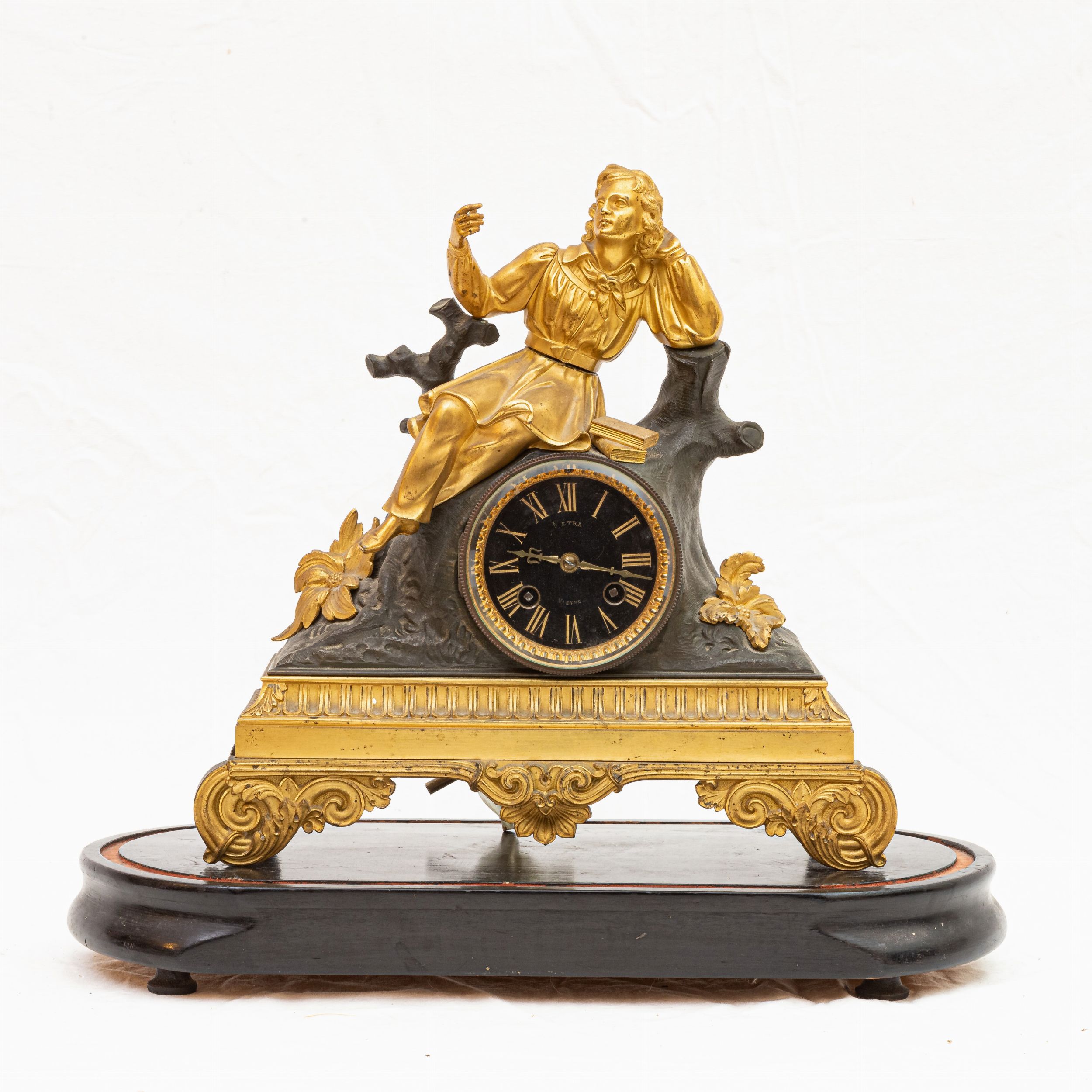 31 x 30 x 10 cm seconda metà XIX secolo con scultura di fanciullo in bronzo dorato su base in metallo a patina bruna e piedini d'appoggio a voluta. Quadrante rotondo a numeri romani dorati con due fori per la suoneria e le ore. Macchina con sospensione a lamina d'acciaio e regolatore a pendolo e suoneria con campana in bronzo. Sul quadrante porta la scritta Vienna. Condizioni: macchina non testata