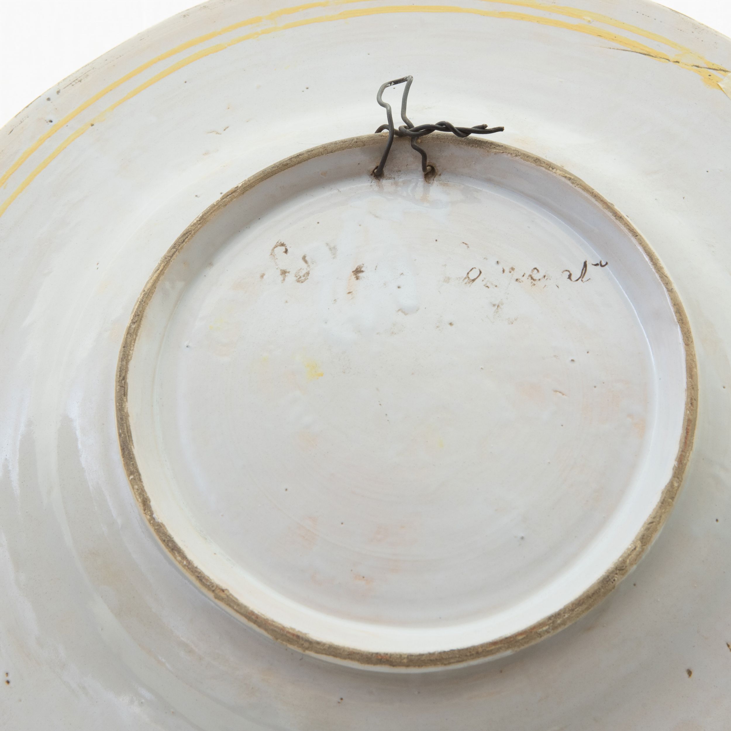 diametro 41 x 4,5 cm fine XIX secolo dalla larga tesa, corta balza e d ampio fondo. Retro con appoggio ad anello. Decoro sulla tesa ad arpie ed animali fantastici su fondo avorio. Nel cavo scena tratta dall'antico, probabilmente Re Mida, entro paesaggio con personaggi, satiri e costruzioni. Produzione area metaurense con traccia di iscrizione in manganese sotto smalto al retro.