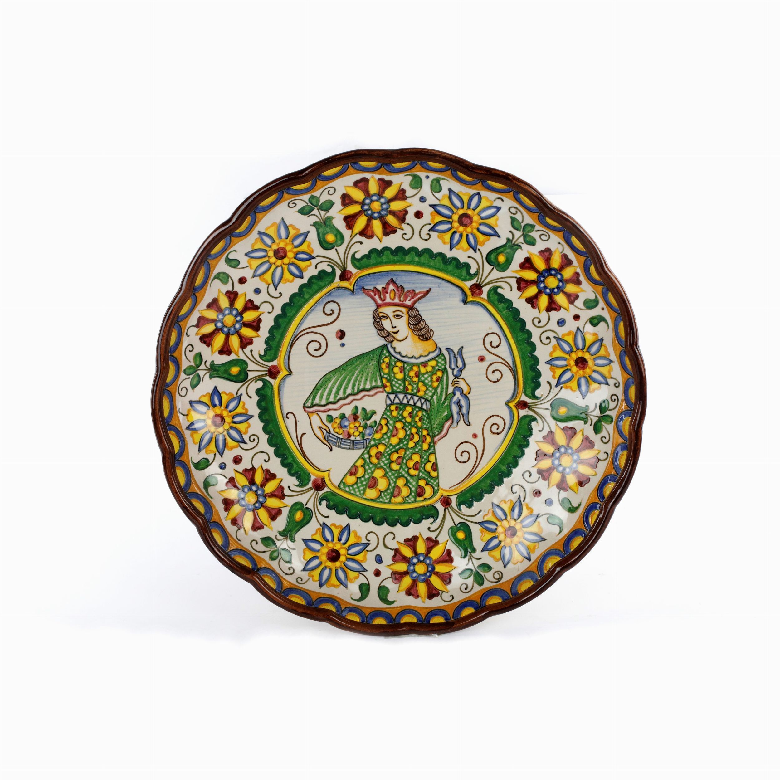prima metà XX secolo con figura femminile sul fondo e decoro floreale nella tesa, marca al retro sotto smalto, manifattura Grazia, Deruta.