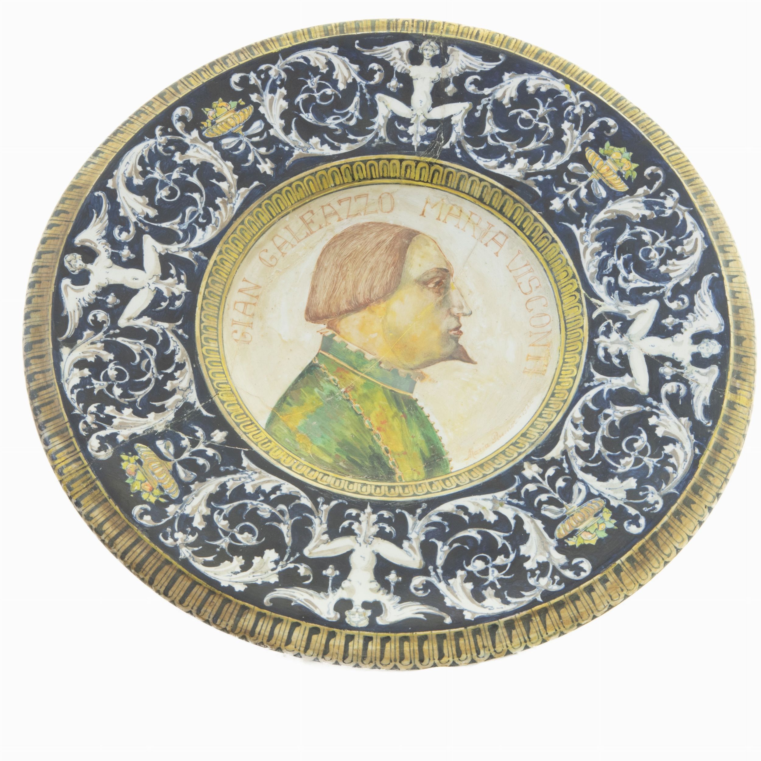 diametro 41 x 5 cm con larga tesa, ripida balza e cavo. Decoro con grottesche e racemi in bianco su fondo blu nella tesa, ritratto di Gian Galeazzo Maria Visconti su fondo bianco nel cavo. Doppia firma manifattura Ceramica Laresina Lodi e al retro, Maria Rumor 1922 nel cavo sotto al ritratto. Condizioni: restauri e mancanze