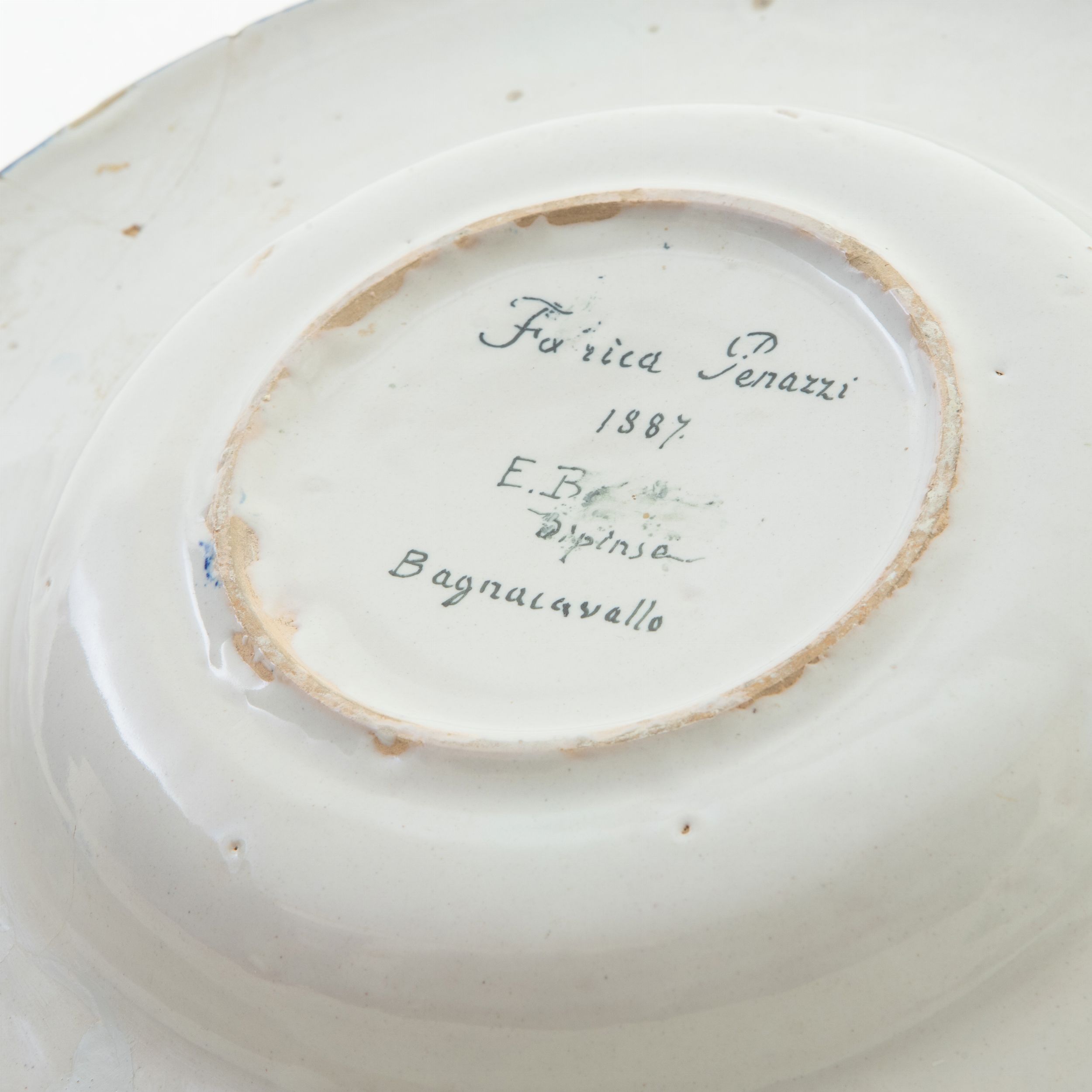 31,5 x 3 cm ultimo quarto XIX secolo dall'ampia tesa con orlo leggermente ribassato, corta balza, e fondo piano. Decoro sulla balza a girali fitomorfe e figure fantastiche. Al centro del piatto ritratto di giovane fanciulla identificabile con la scritta al retro. Manifattura Penazzi Piatto firmato e datato 1887 Condizioni: restauri e rifacimenti