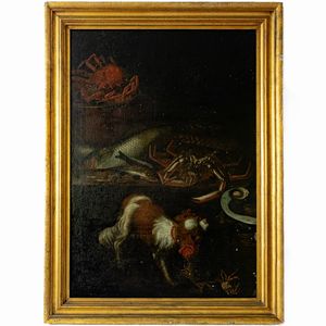 Pittore napoletano, natura morta composizione con crostacei e cagnolino