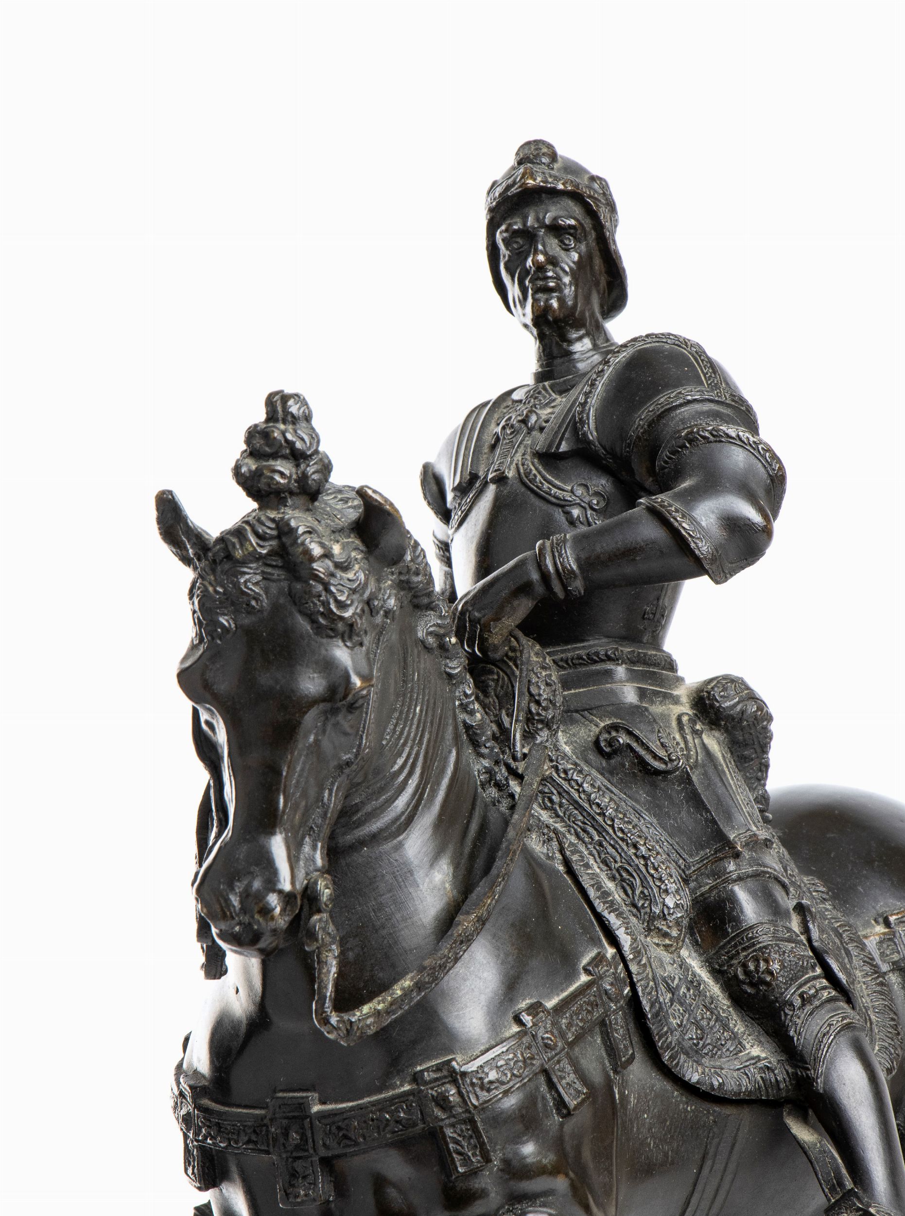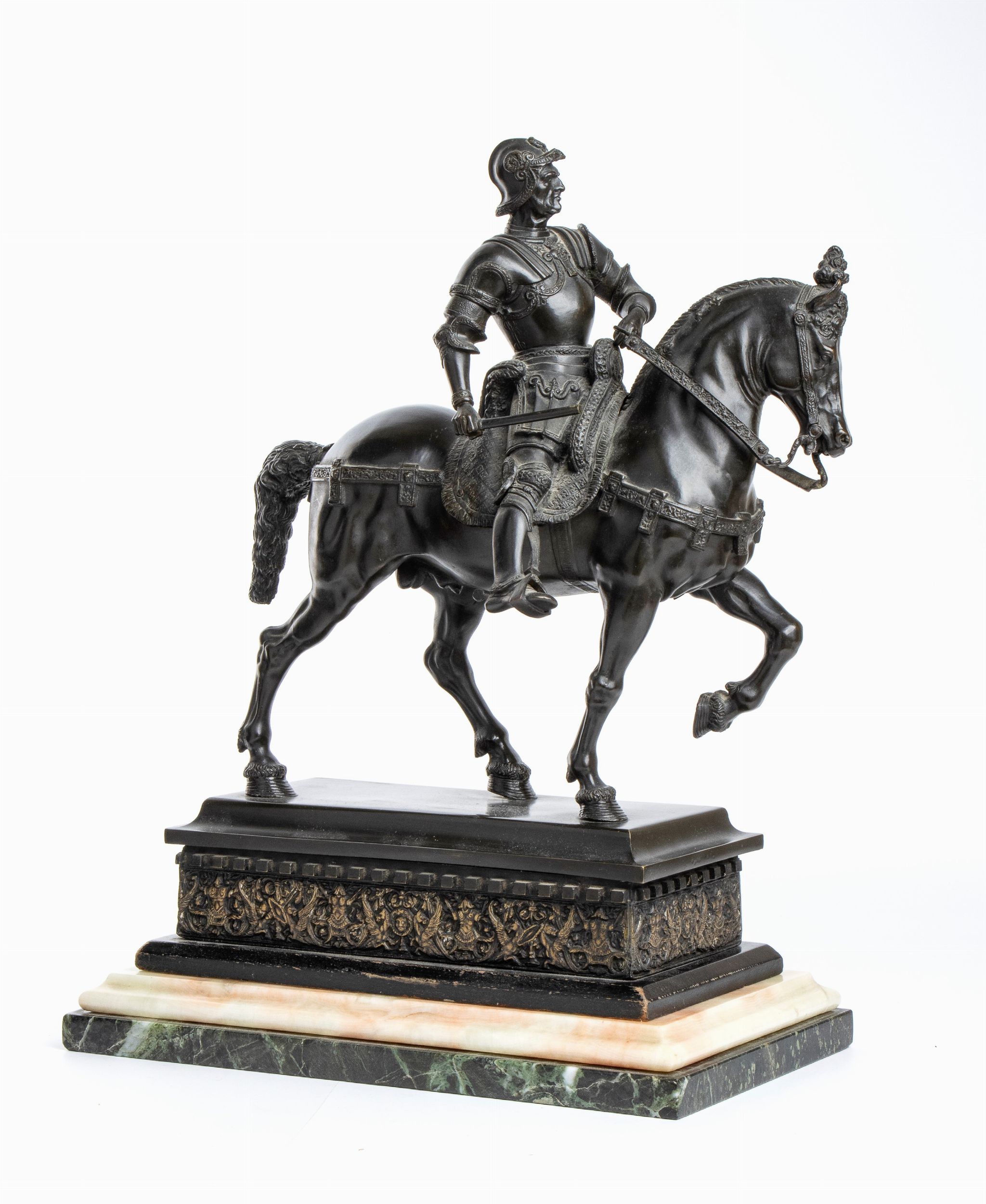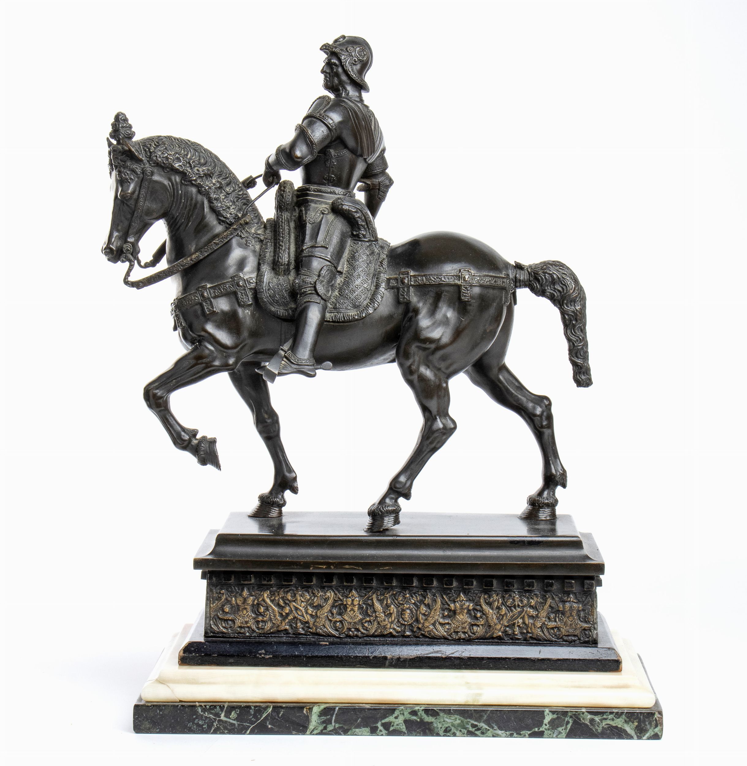 Bronzo patinato nero, scultura: 43 x 31 x 16 cm XIX secolo Questo monumento equestre riproduce la notissima scultura dedicata al condottiero Bartolomeo Colleoni collocata a Venezia, in Campo San Zanipolo. Il monumento fu commissionato ad Andrea del Verrocchio e realizzato fra il 1480 e il 1488. Si tratta di uno dei più importanti monumenti equestri del Rinascimento. La copia in esame risale probabilmente al XIX secolo e si erge su una bella base in marmi misti.