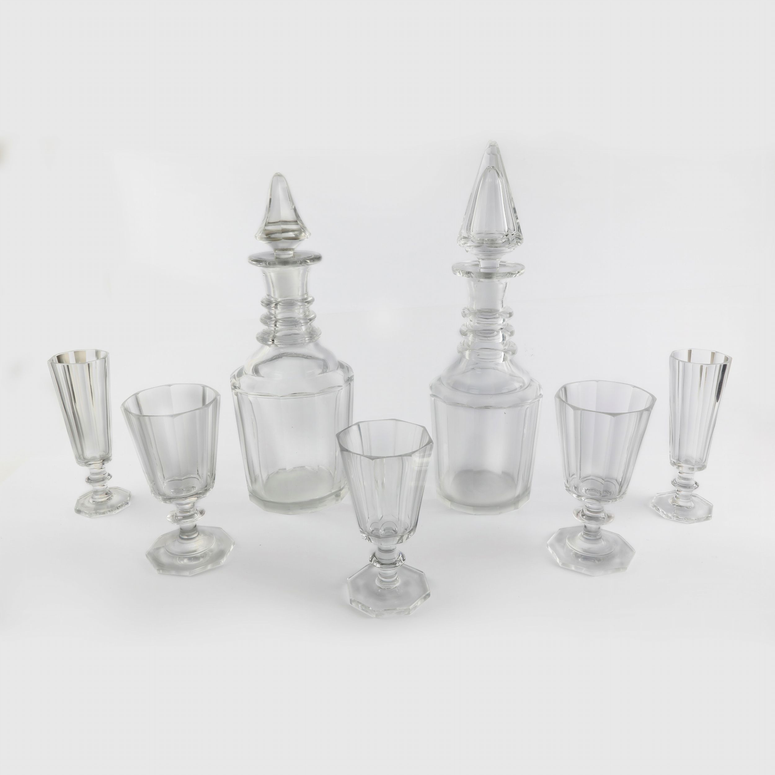 prima metà XX secolo per otto, a forma di calice ottagonale, corpo svasato verso il basso con anello su base. In tre diverse altezze pezzi ventotto più due bottiglie en suite. Condizioni : minime scheggiature e mancanze