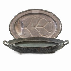 43 x 25 x 6 cm; 35 x 20 x 4,5 cm Prima metà XX secolo di forma ovale, parte incisa, in metallo argentato [..]
