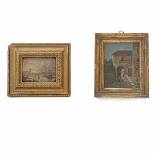 8,5 x 11,5 cm ; 15 x 12 cm Prima metà XX secolo scorcio di paese olio su tavola; veduta portuale olio su pie [..]