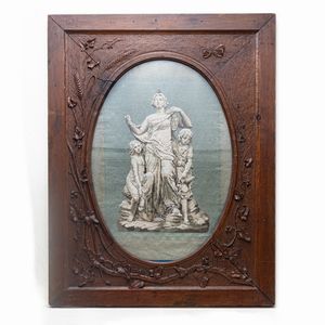 tessuto e perline, 100 x 77 cm Francia, fine XIX secolo entro cornice in legno ad assetto ovale con decorazioni [..]