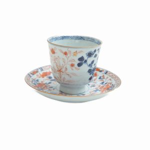 Tazza con piatto in porcellana policroma a decoro Imari,