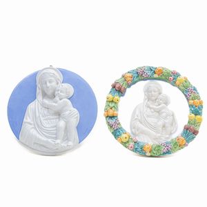 26,5 x 6 cm 27,5 x 3 cm manifattura italiana, seconda metĂ XX secolo lotto di due tondi in ceramica policrom [..]