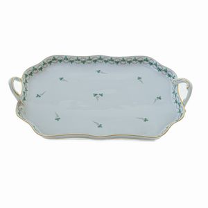 46 x 30 x 3 cm profilo mistilineo, bordo rialzato, prese a ramoscello, con al retro appoggi ad anelli. Decoro [..]