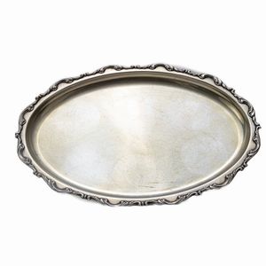 60 x 47 x 3 cm 1894 in argento 800/1000 e legno, di linea centinata con due piedi a virgola. Parti incise, [..]