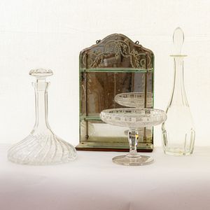 Lotto di quattro oggetti:Â due bottiglie, un centrotavola ed una specchiera con [..]