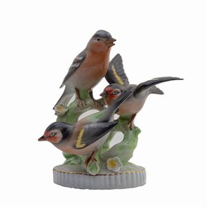 Gruppo di tre uccellini in porcellana policroma