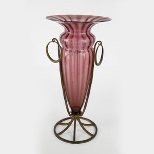 Calice in vetro color viola fumè entro struttura in ferro