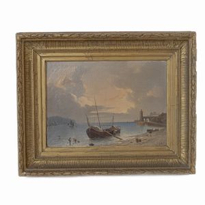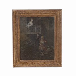 dipinto ad olio cartone, 15 x 10 cm entro cornice in stucco dorato a palmette coeva, firmato.