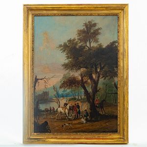 Scorcio di paesaggio nord europeo con personaggi, alberi e cittÃ