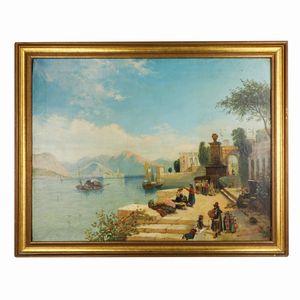 dipinto ad olio su tela, 50 x 63; 72 x 50 cm inizi XX secolo paesaggio montano con scorcio di lago, città e viandanti; [..]