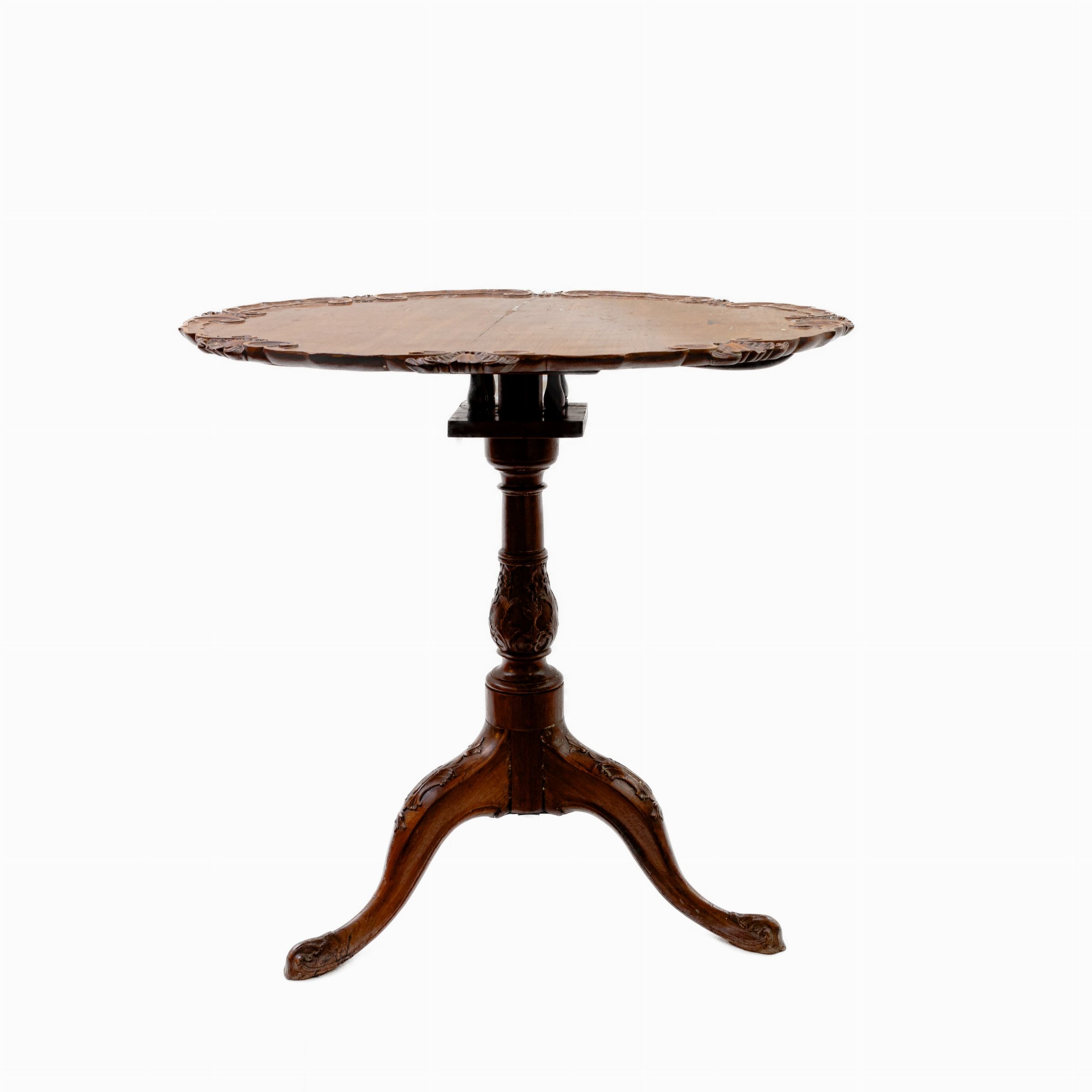 XIX secolo piano tondo con motivi floreali, corpo a fuso desinente a tre gambe. Parti incise e scolpite a motivi floreali
