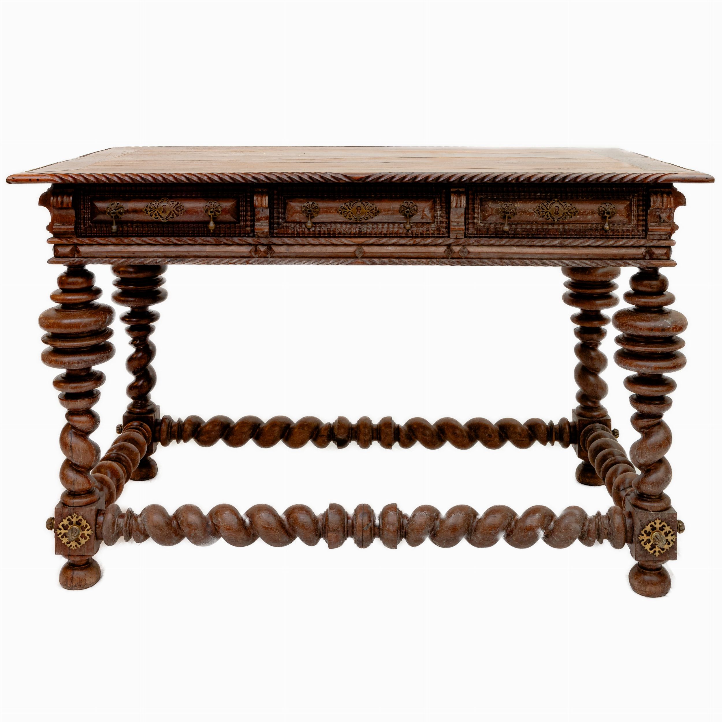 XIX secolo  a tre cassetti più tre cassetti finti in legno di mogano, con quattro gambe a tortiglioni rastremate verso il basso raccordate alla base, piano con bordo godronato.