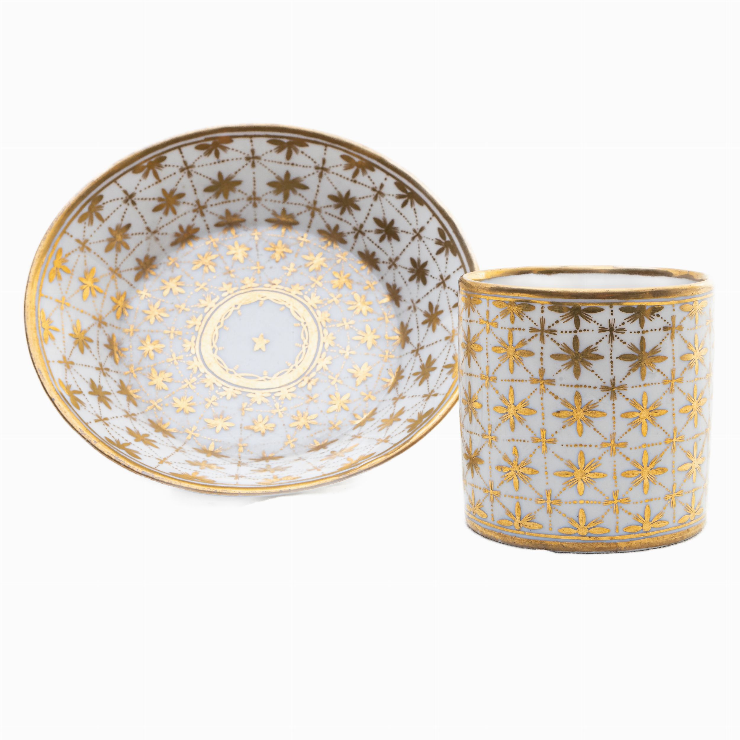 in porcellana bianca con decoro a graticcio in oro zecchino e presa ad orecchio di elefante. Piatto en suite con la tazza, manifattura francese, fine XVIII inizi XIX secolo
