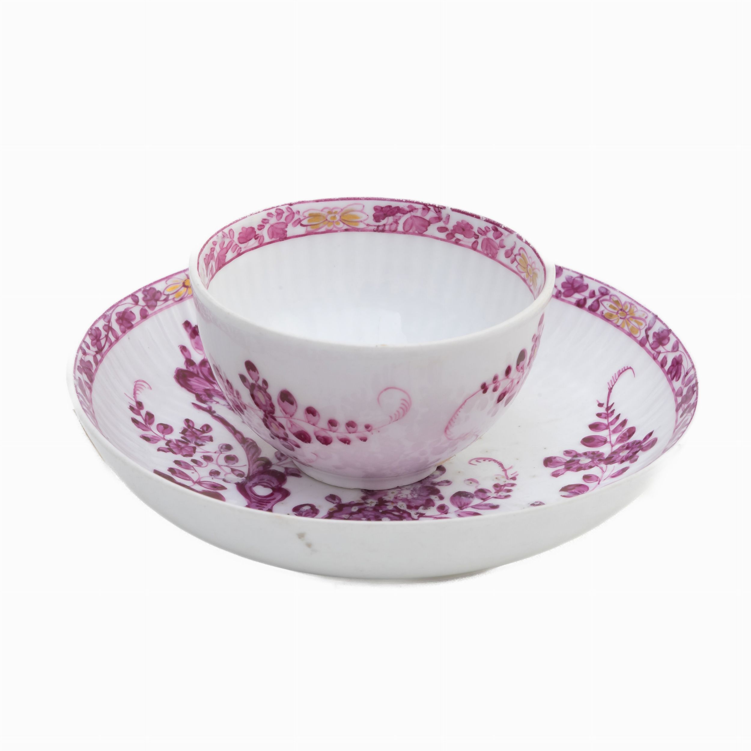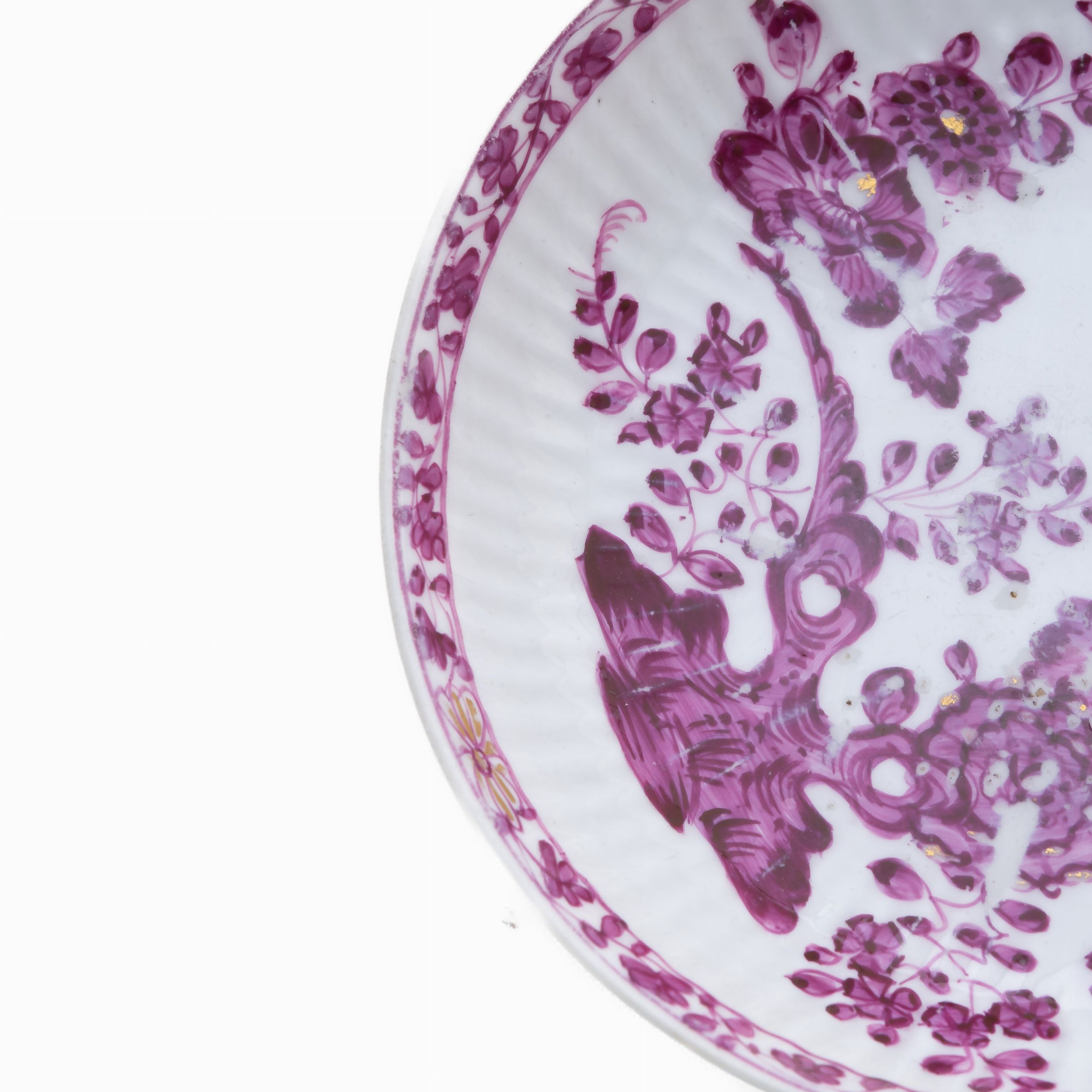 di forma a campana con decoro floreale in porpora di Cassio su fondo bianco. Piatto en suite, finiture in oro zecchino. Manifattura di Meissen, prima metà XX secolo gestione Pfeiffer