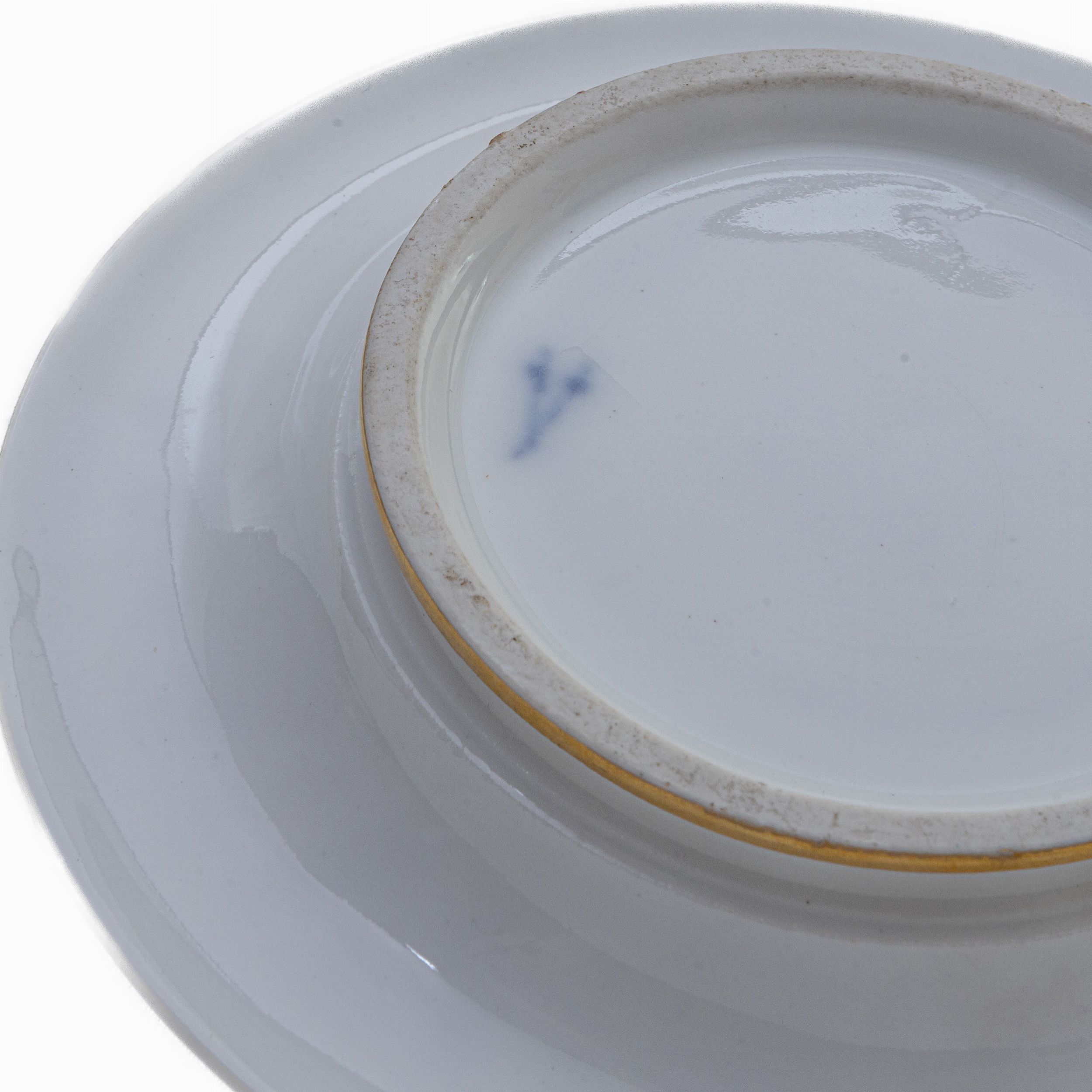 tazza 7 x 5,5 cm; piatto 14 x 2 cm prima metà XIX secolo con veduta di Monaco entro riserva, decoro dell'interno della tazza e della presa in oro zecchino; piatto con base ad anello, bordo leggermente estroflesso e perlinatura all'interno del cavetto. Decorazione in oro zecchino a motivi floreali in porpora di Cassio a bulbi alternati. Manifattura tedesca con stampigliatura in blu sotto smalto alla base del piatto Condizioni: presa della tazza restaurata, leggere usure alle dorature, probabile mariage.