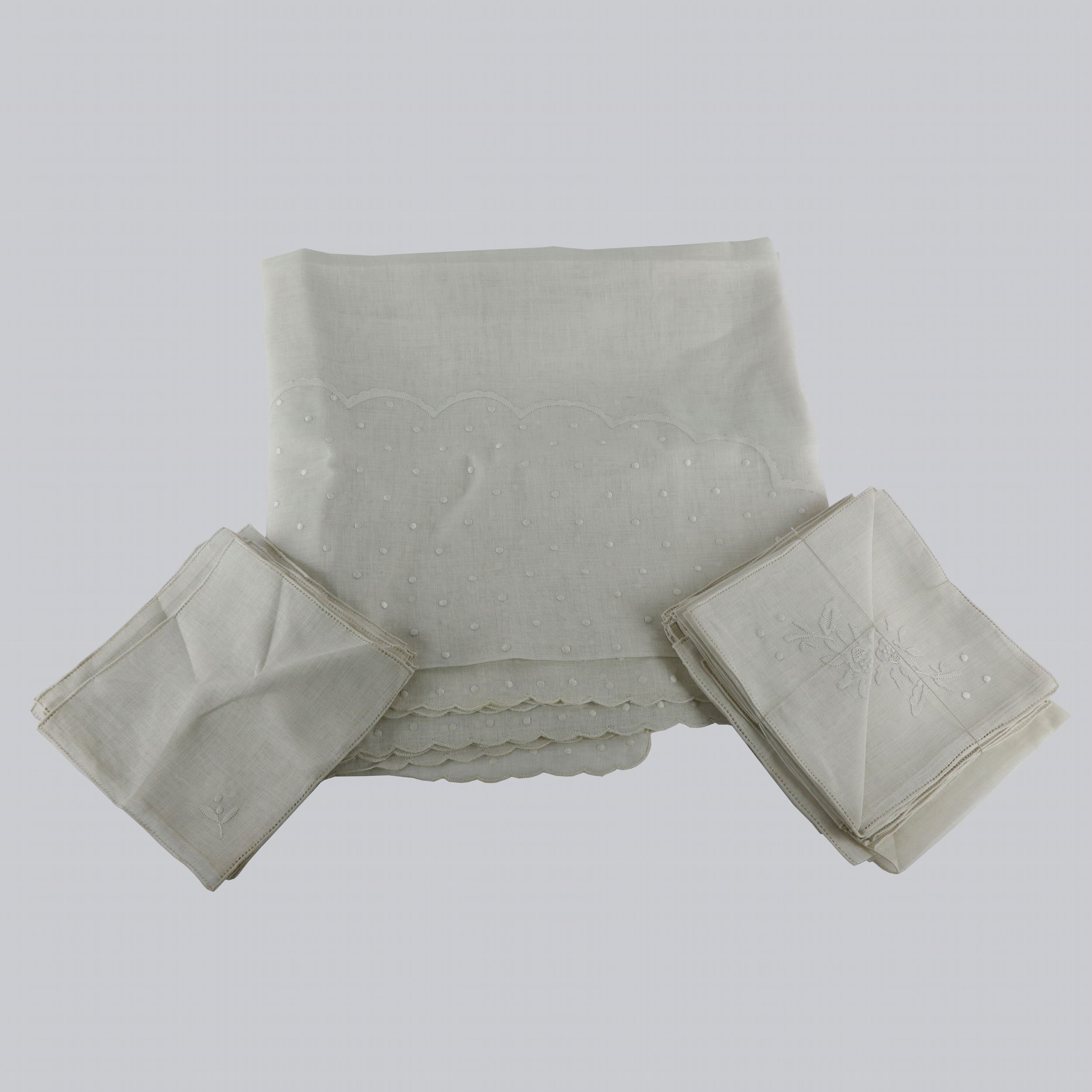 Tovaglia in lino bianco con ricamo floreale e pallini,