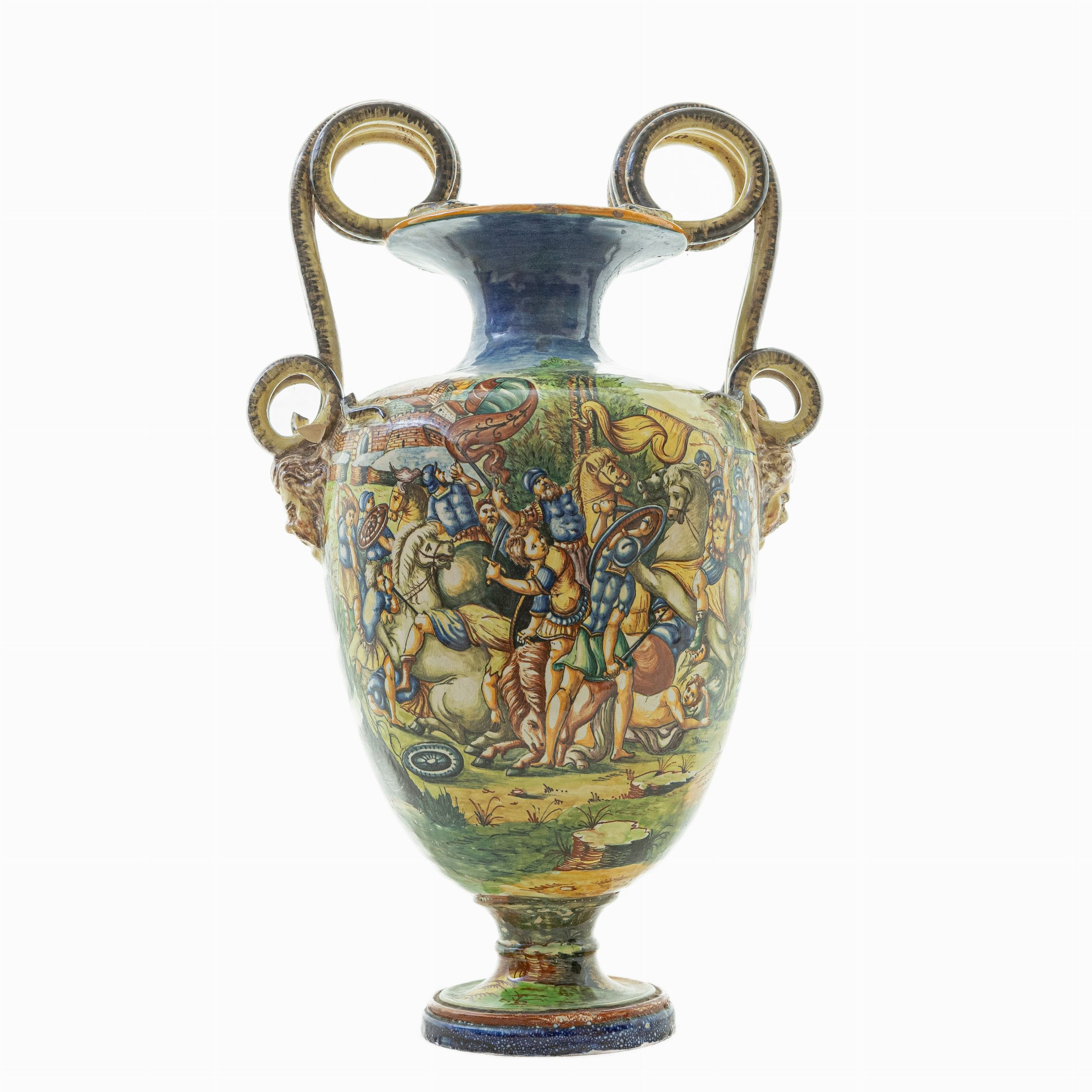 45 x 12 cm con prese a serpente poggianti su teste stilizzate. Piede con corto collo ad appoggio anulare, decorazione istoriata con scena di battaglia su un lato e scorcio di fiume con montagne sull'altro. manifattura Fratelli Minardi, primo quarto XX secolo Faenza Condizioni: mancanze ad una presa