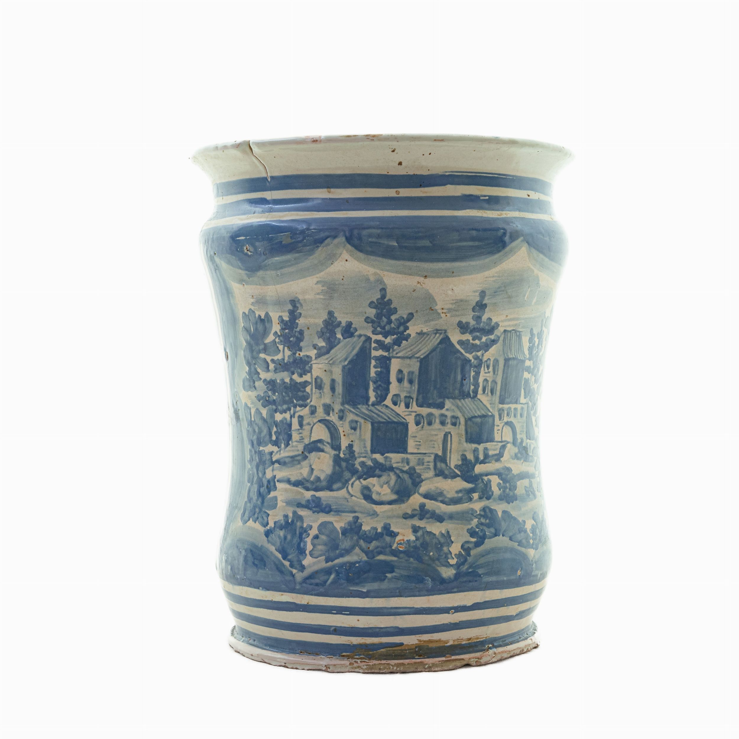 20,5 x 26 x 16,8 cm Napoli, seconda metà XVIII secolo foggiato al tornio di forma a rocchetto con bordo estroflesso. Decoro entro riserva a scorcio di paesaggio con case ed alberi su fondo bianco.