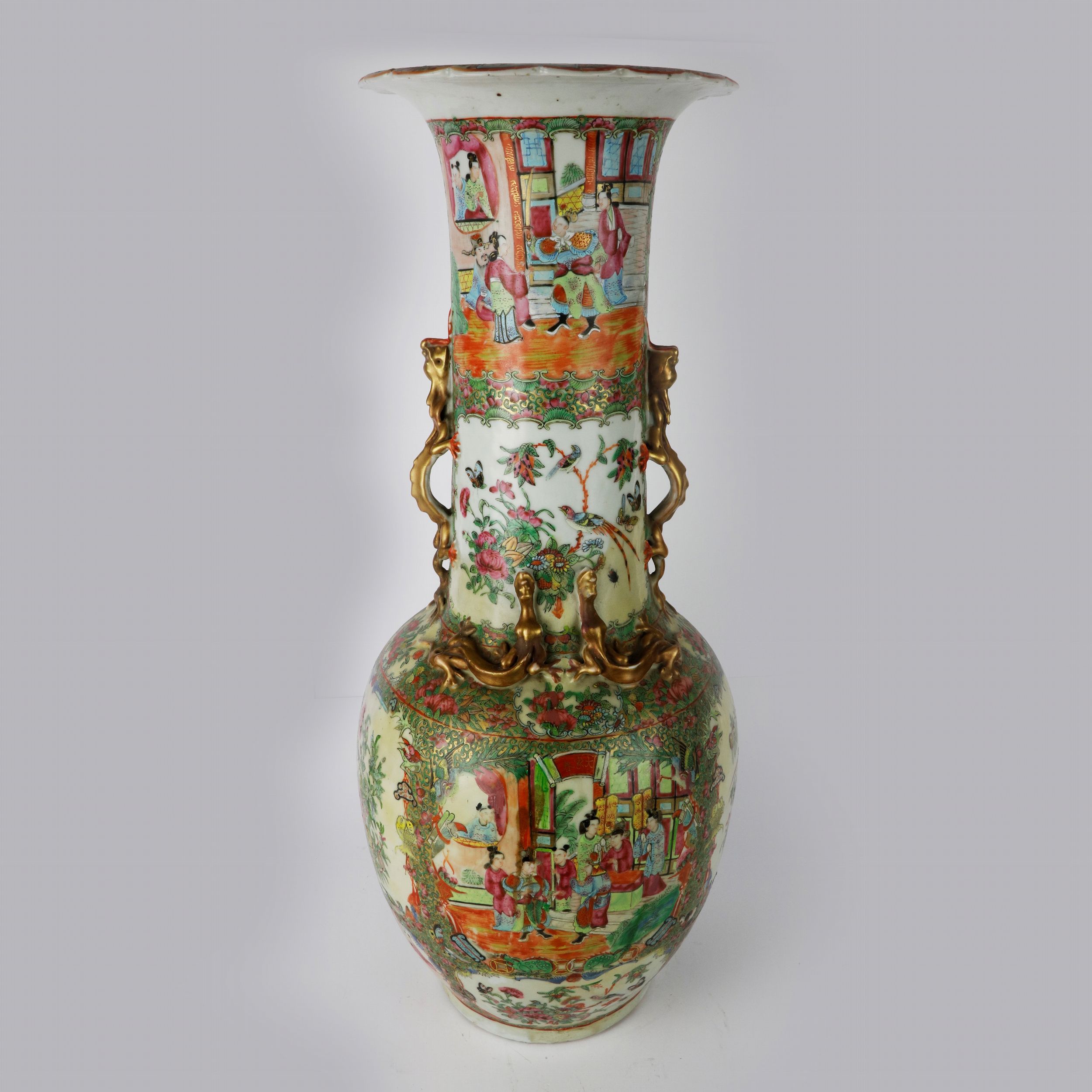 65 x 7,5 cm Canton seconda metà XIX secolo dal corpo globulare, con collo a tromba rastremato verso l'alto e piede ad anello, prese a forma di drago. Decorato a scene di genere entro riserve vegetali con finiture in oro zecchino. Condizioni: fondo restaurato.
