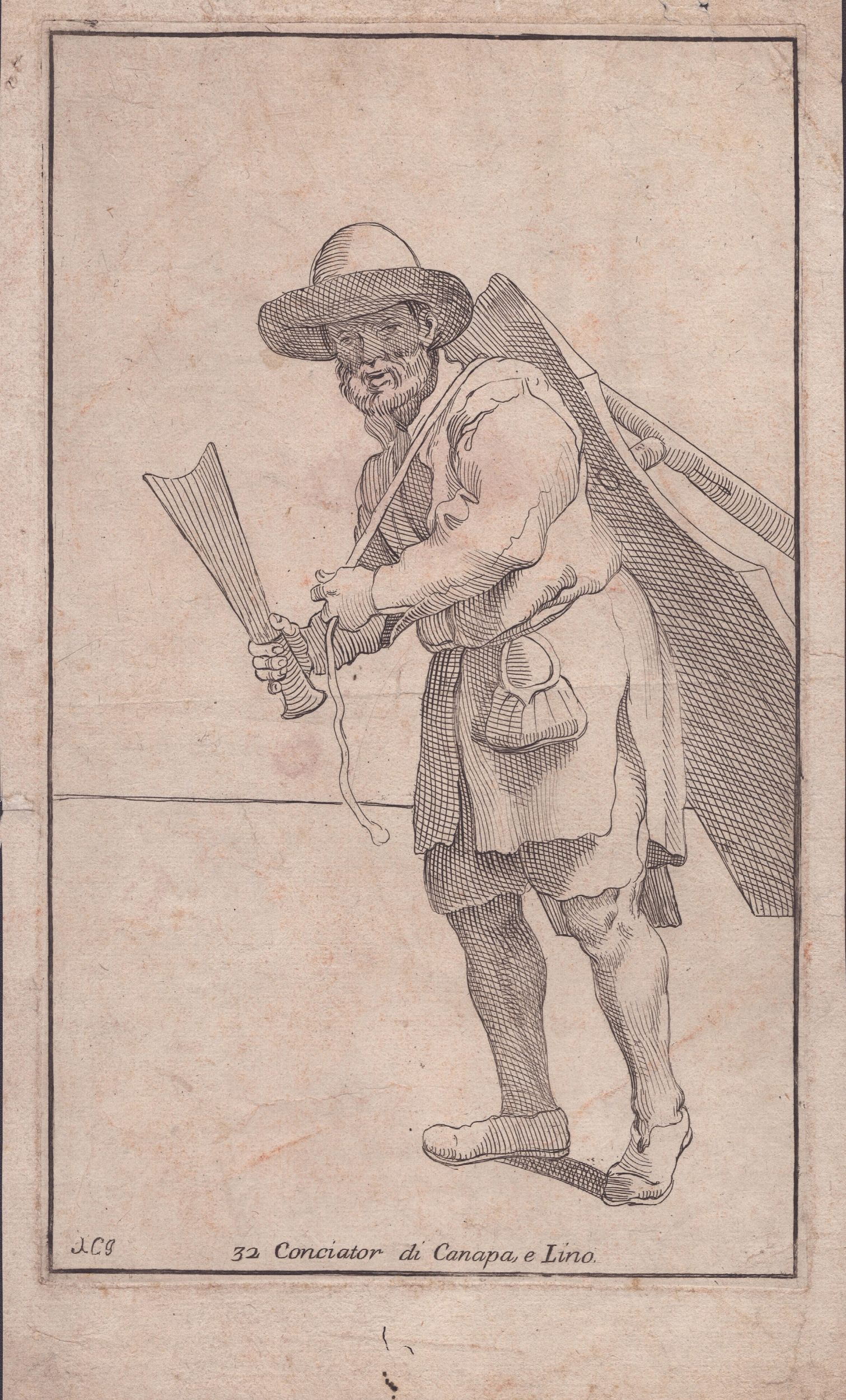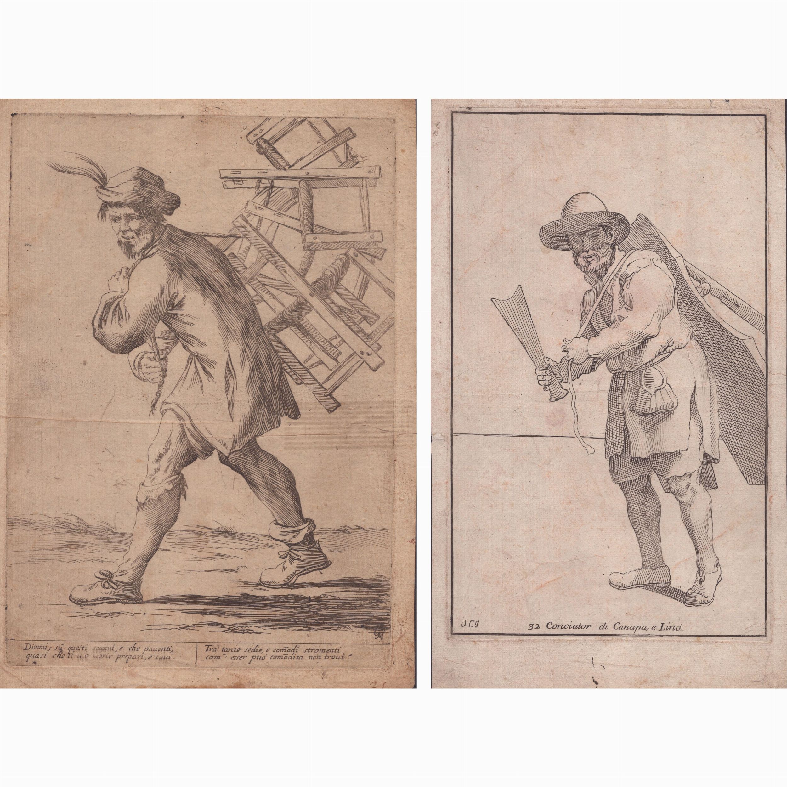 1660 dalla serie Le Arti di Bologna, da Annibale Carracci, acquaforte, 278 x 195 mm (lastra), 300 x 218 mm (foglio). Bella impressione su carta vergata. Condizioni: foglio ossidato, con una piega centrale e qualche sgualcitura in basso. Per il resto in condizioni molto buone. Incluso: 'Conciator di Canapa, e Lino' di Simon Guillain (da Annibale Carracci), acquaforte, 310 x 185 mm (foglio). Stampata su carta vergata con filigrana. Foglio in buone condizioni salvo un piega centrale.