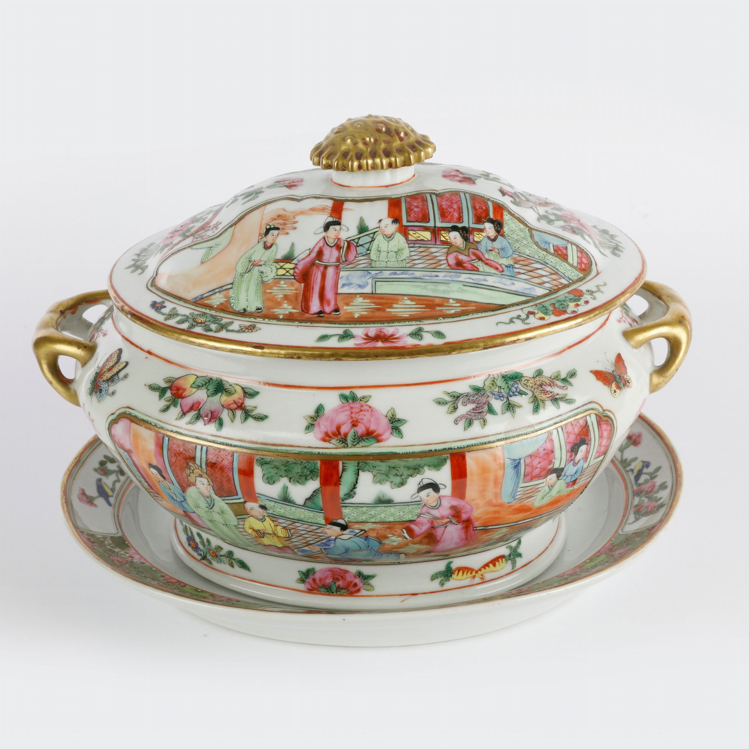 20 x 30 x 20 cm , 29,5 x 23,5 x 4 cm Canton, seconda metà XIX secolo in pasta bianca, con decoro a scene dalla tradizione dell'Estremo Oriente, entro riserve bordate in oro con contorno floreale in policromia e finiture in oro zecchino. Corpo della zuppiera ovale con prese a ramo ed impugnatura del coperchio a bottone. Ultimo periodo dinastia Quing, manifattura di Canton,