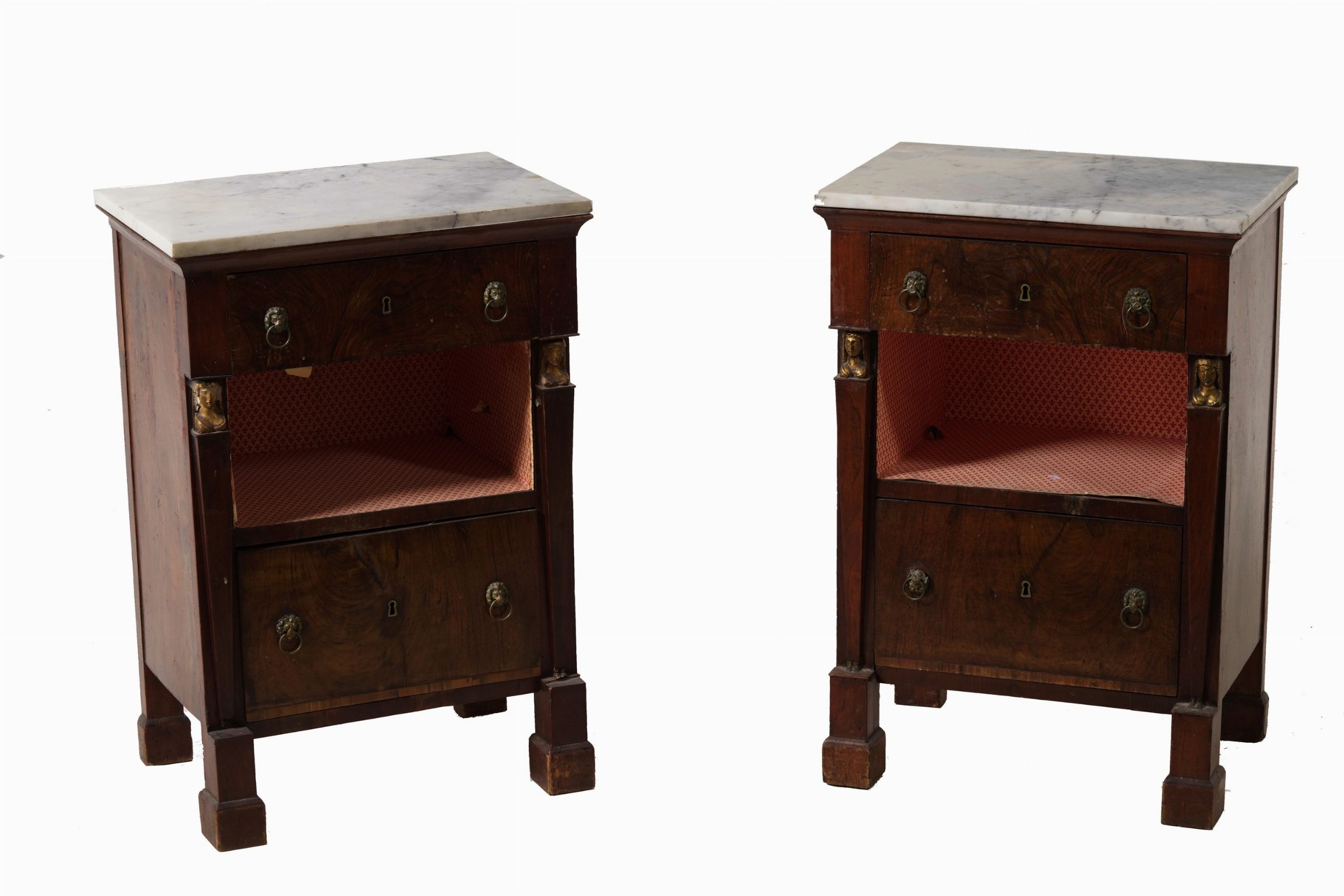 Coppia di comodini Impero lastronati in piuma di mogano. XIX secolo