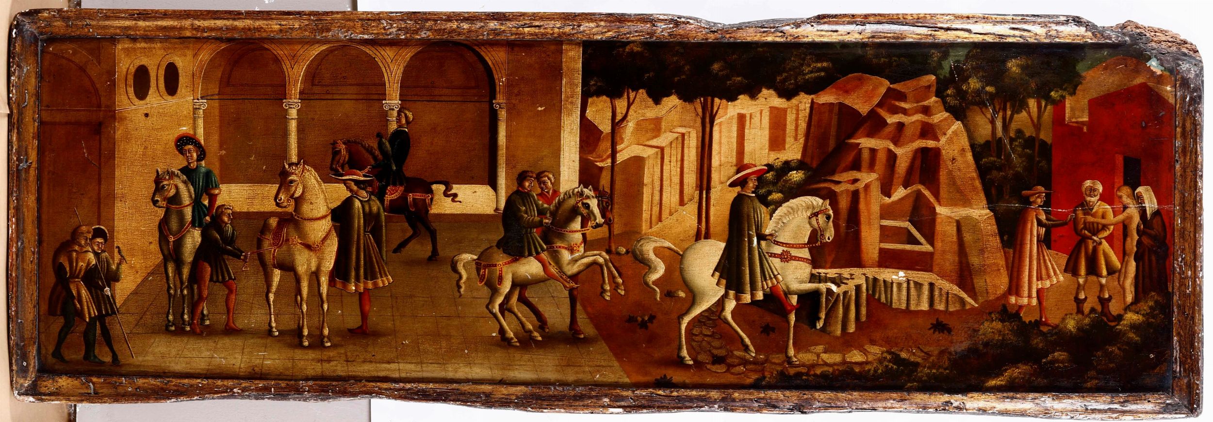 Frontone su tavola dipinta in stile quattrocentesco con scene cavalleresche