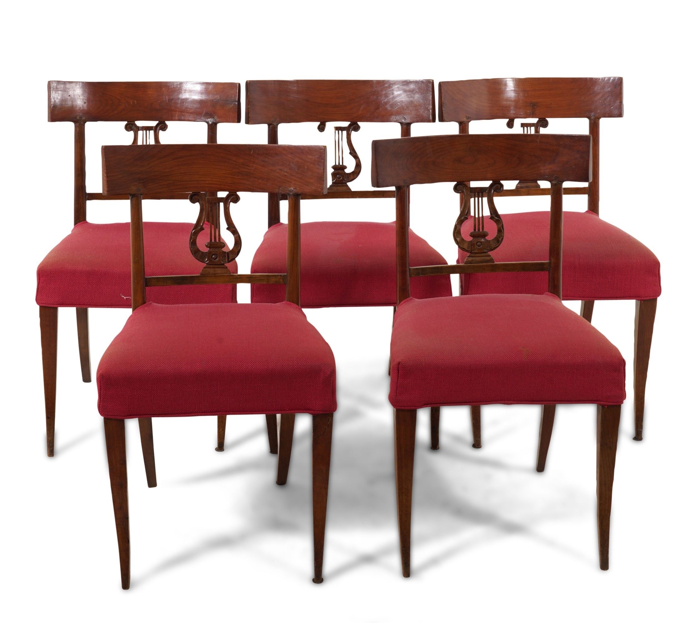 Gruppo di cinque sedie in ciliegio con schienale intagliato a lira, XIX secolo