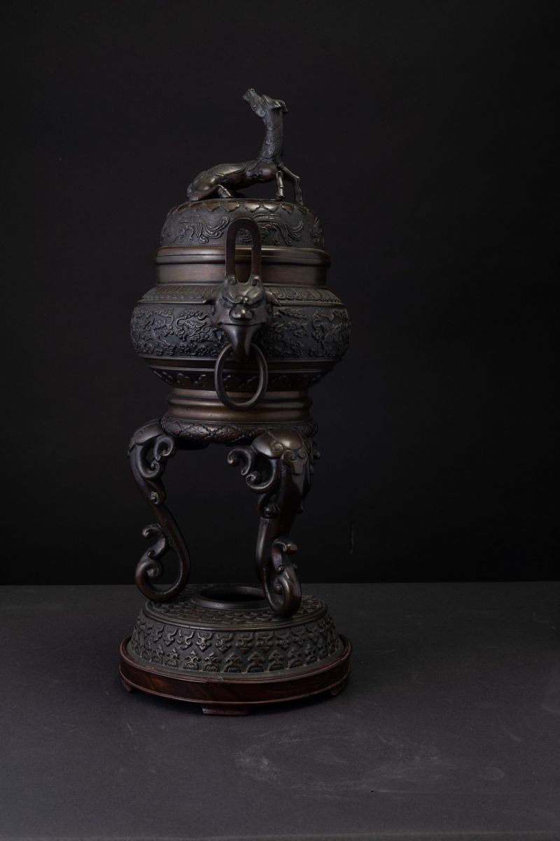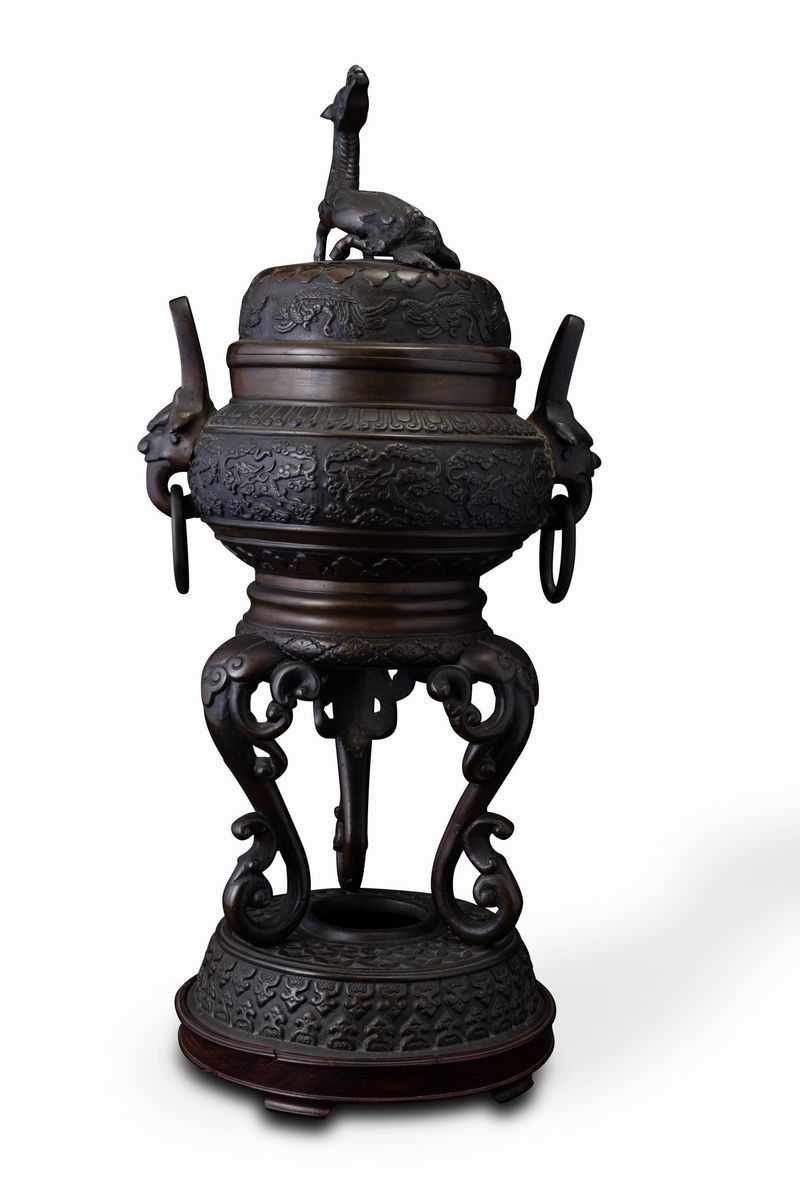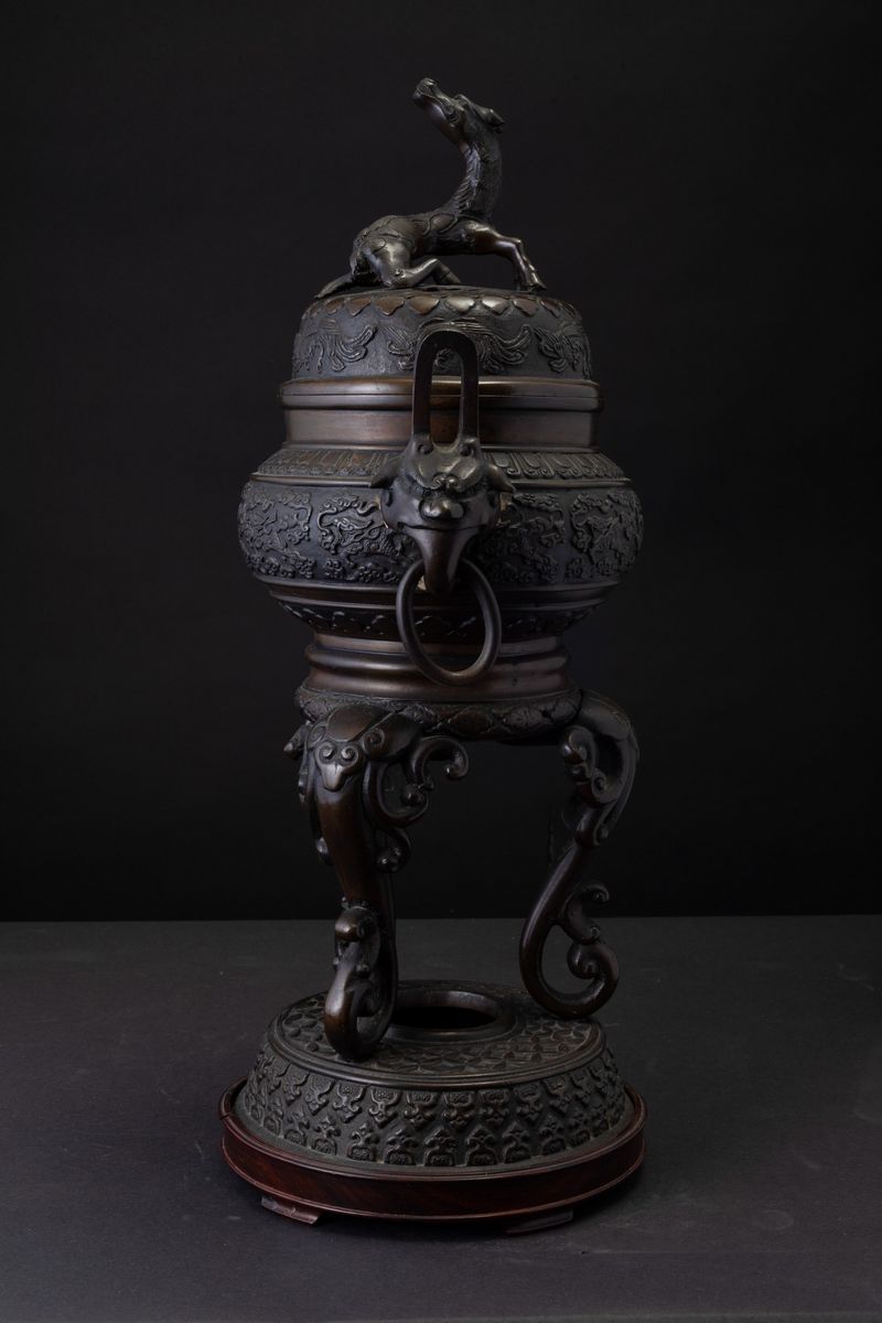 Incensiere tripode in bronzo con mascheroni, anse ad anelli, decori a rilievo e [..]