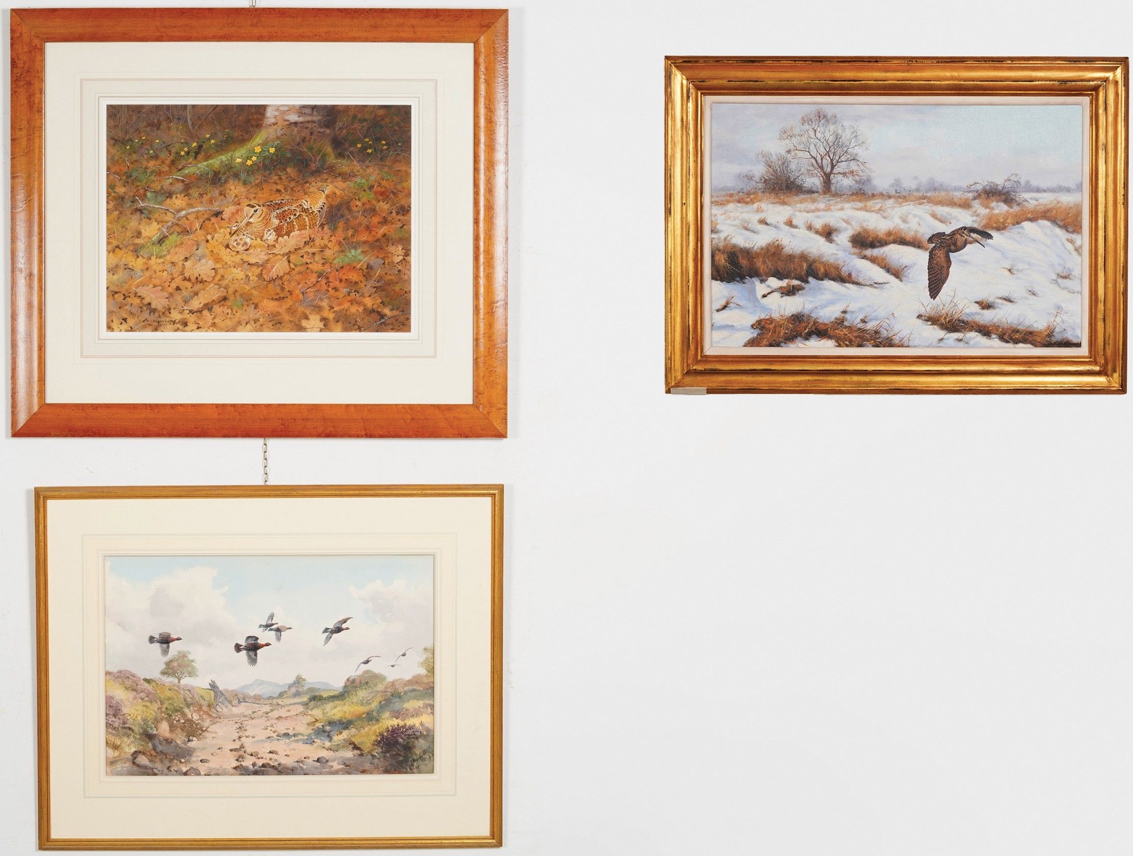 Lotto di tre acquerelli raffiguranti anatre e beccacce