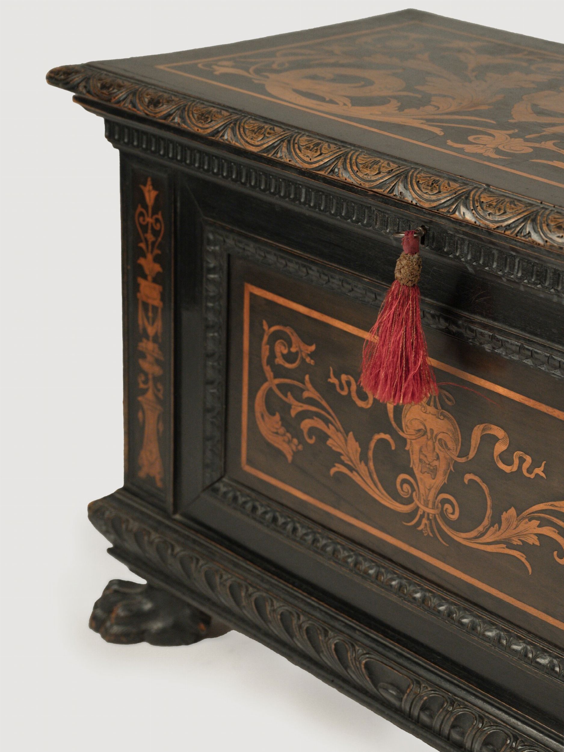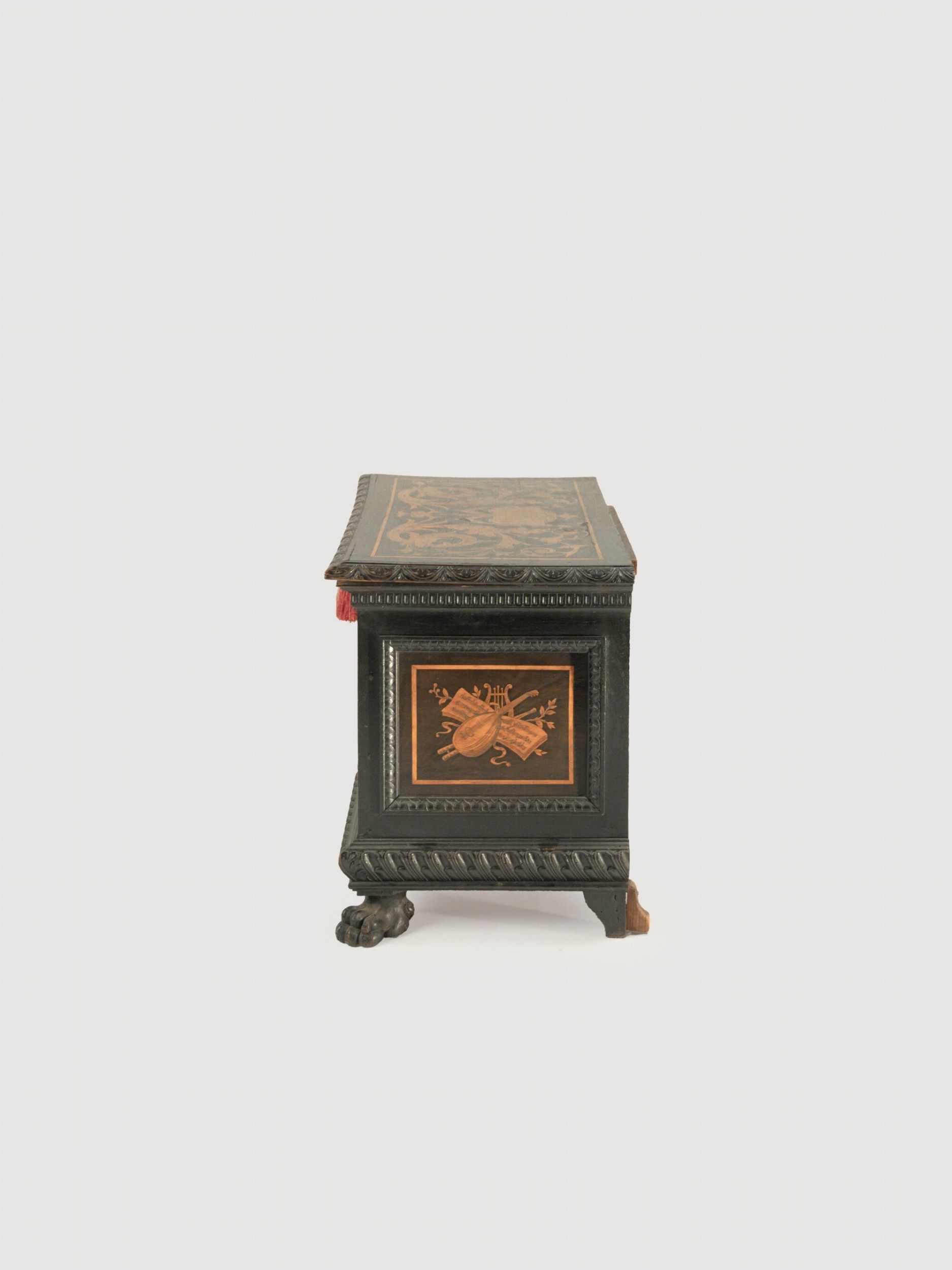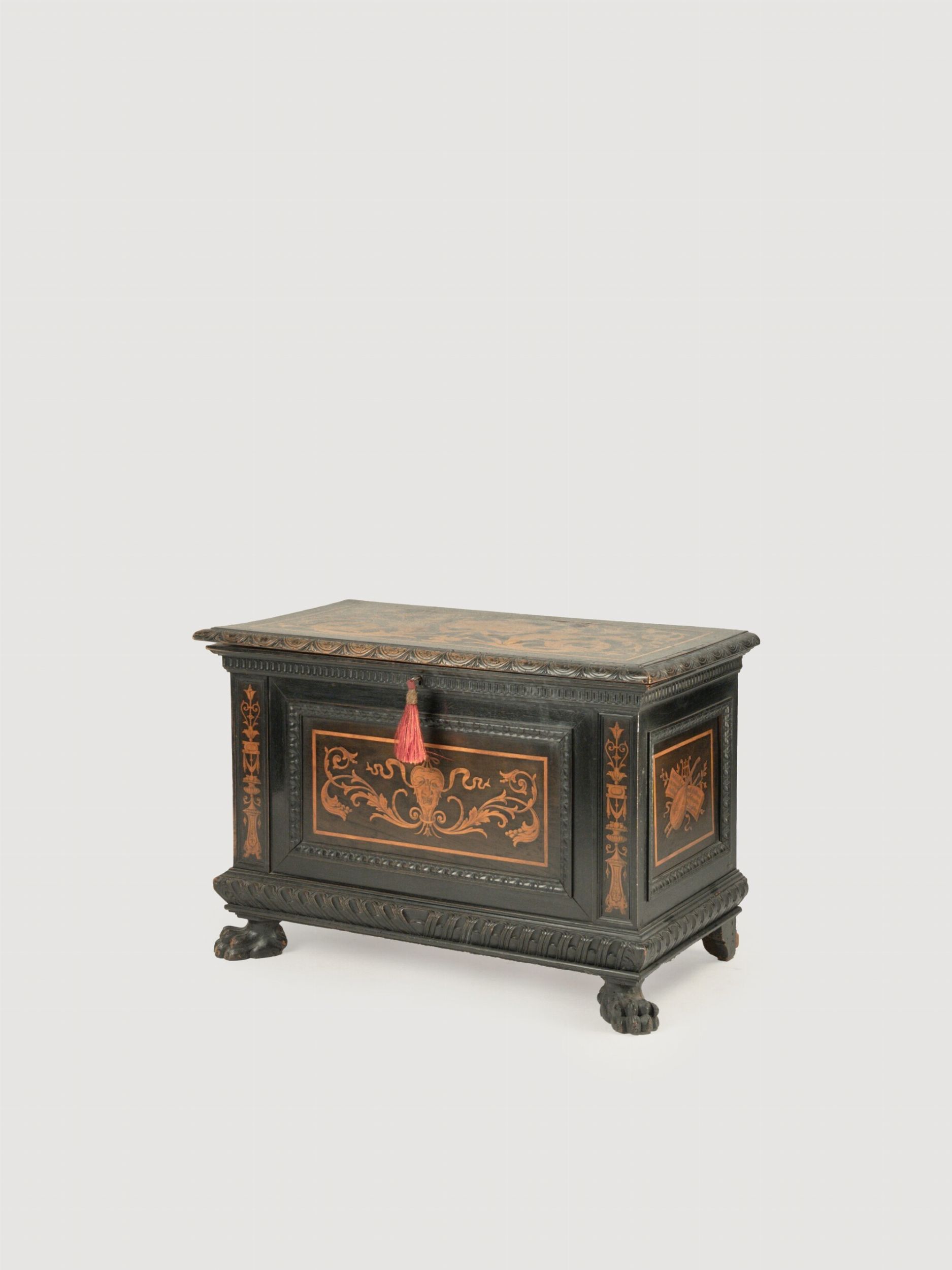Piccola cassapanca in legno ebanizzato intarsiata in legno di frutto, XX secolo