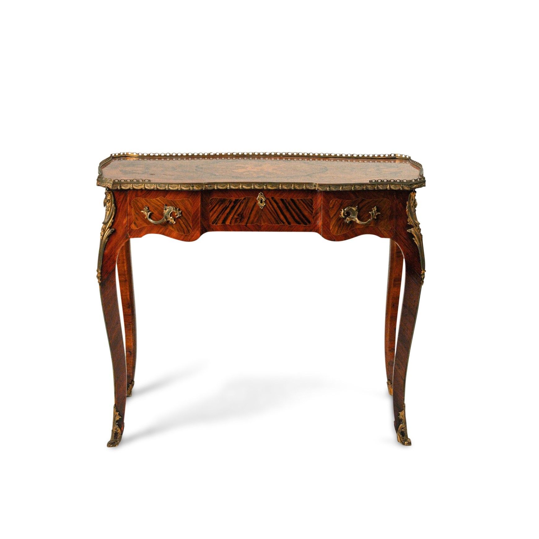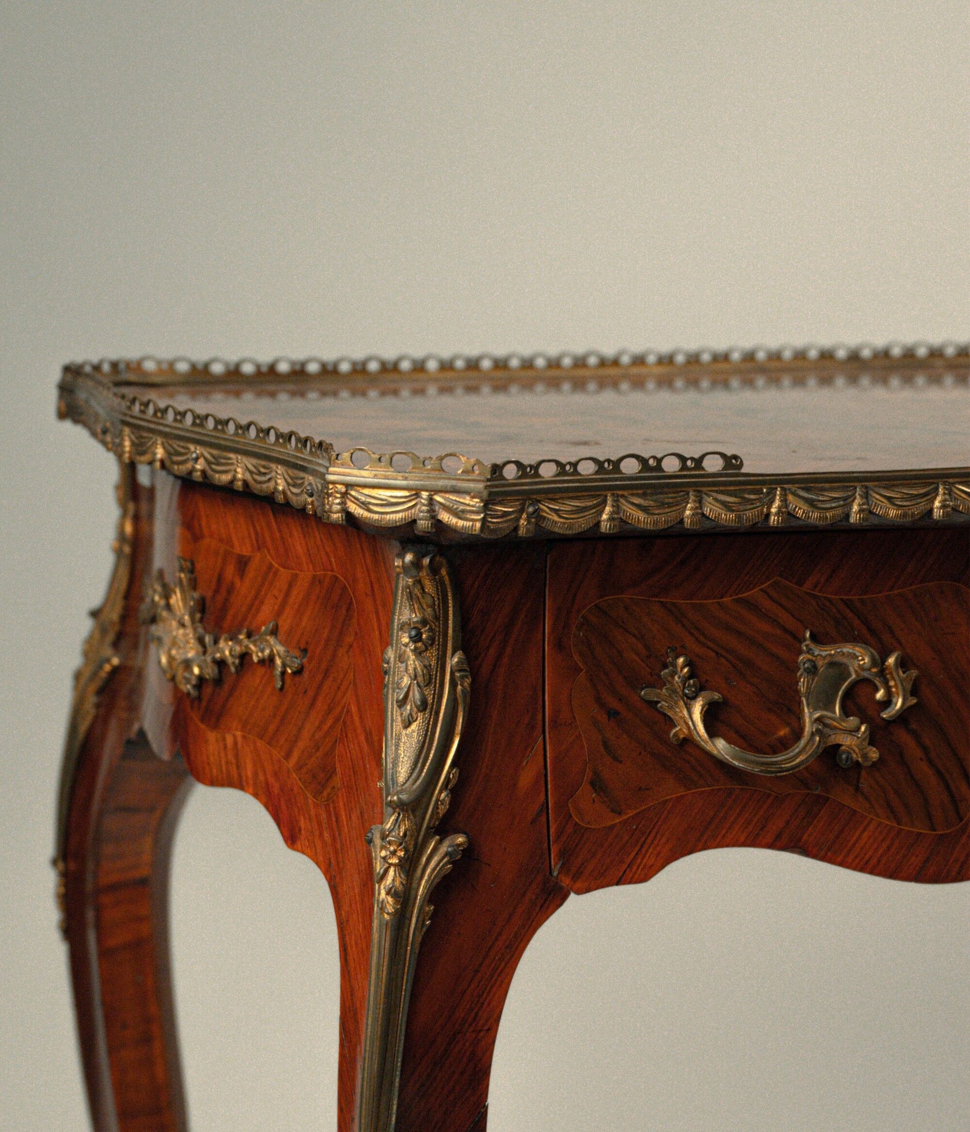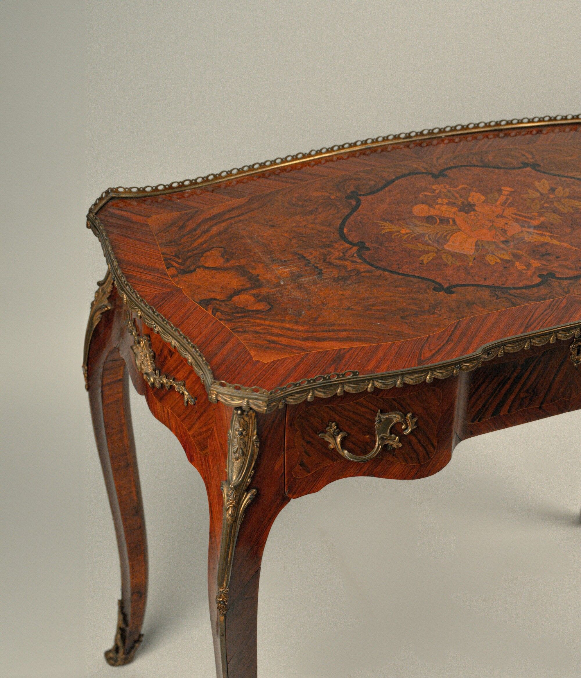 Piccolo scrittoio da centro lastronato e intarsiato in legni diversi, Francia, seconda [..]