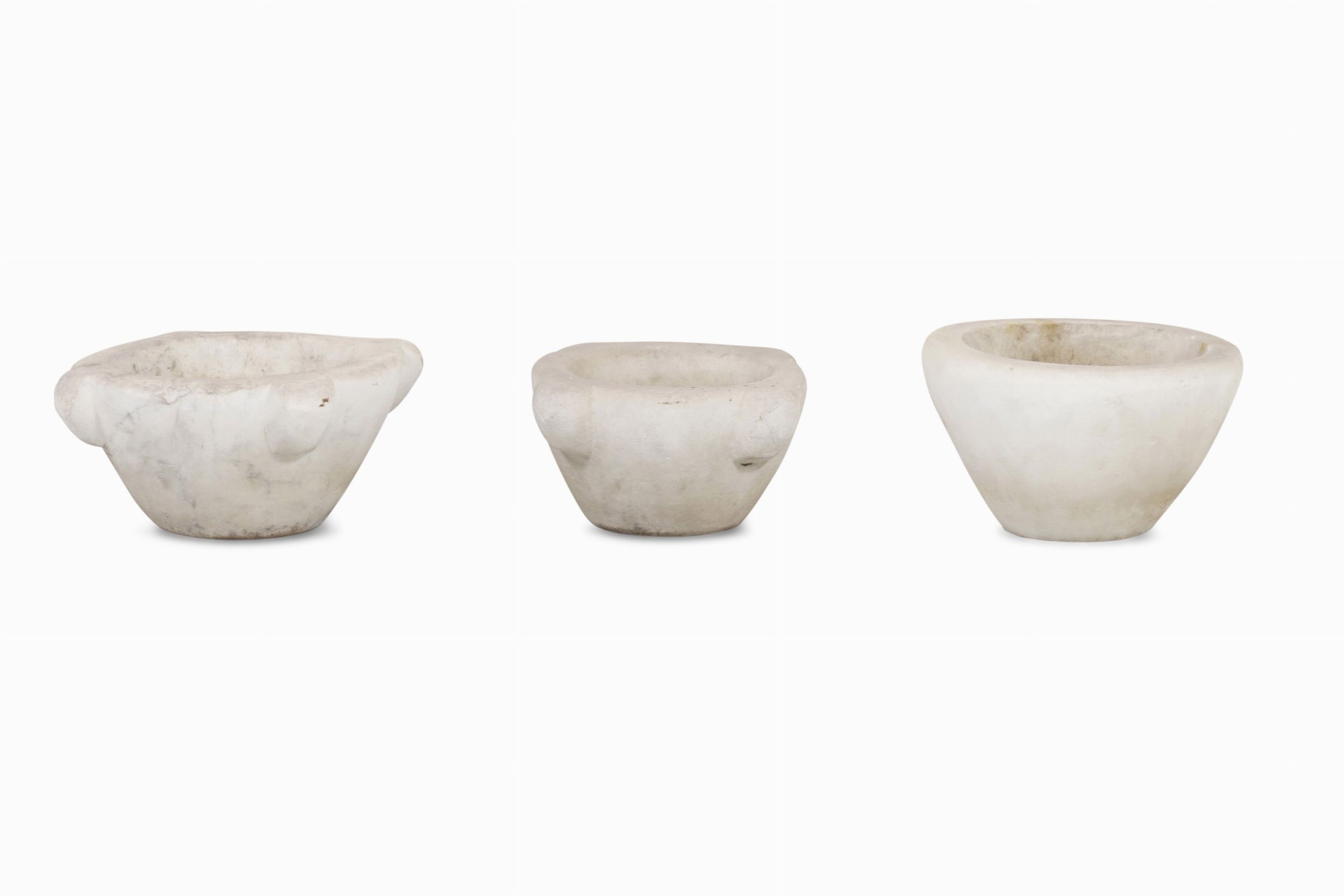 Tre mortai in marmo bianco
