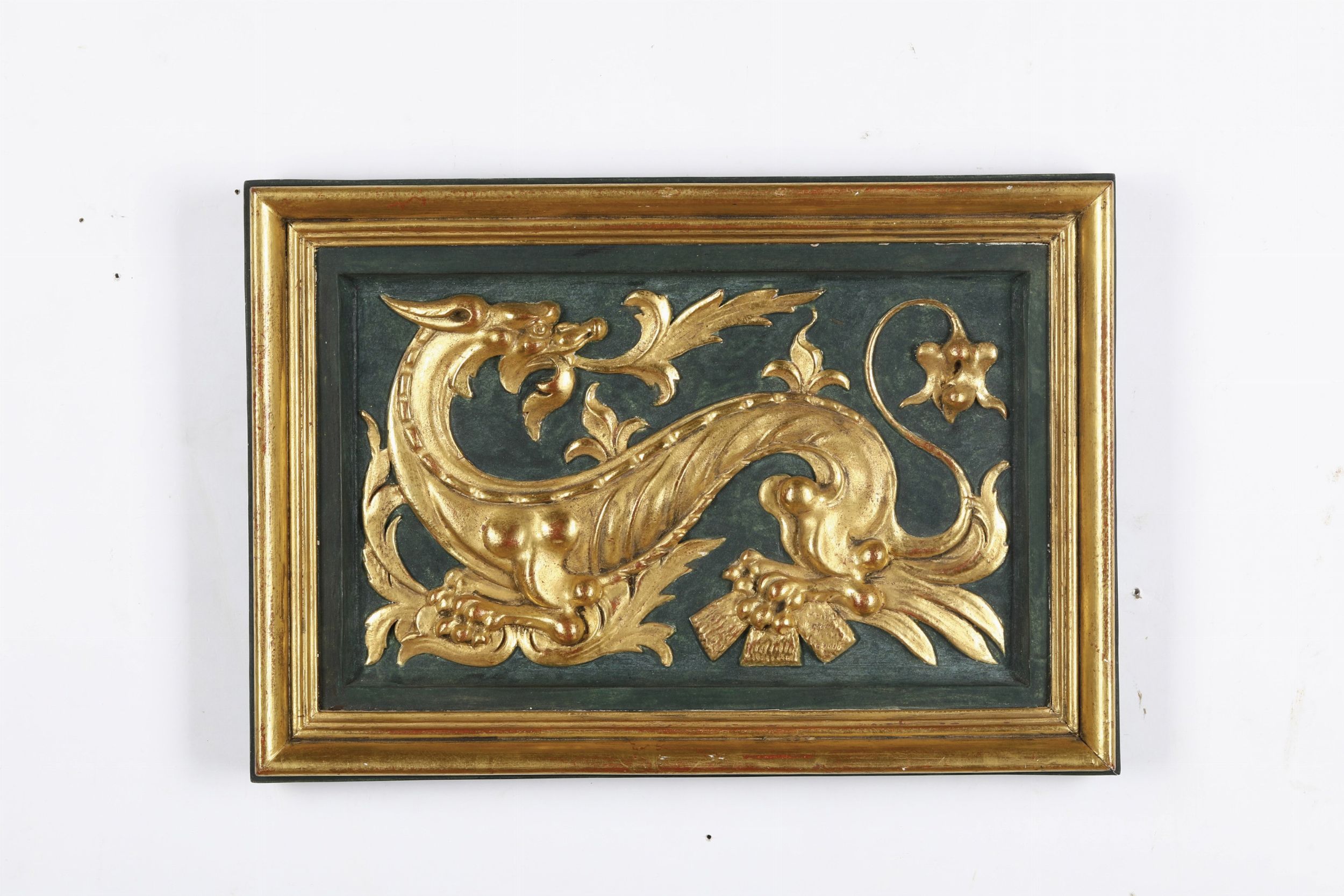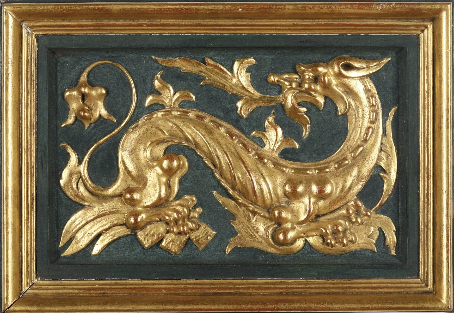 Coppia di formelle con draghi in legno dorato. Italia XVIII-XIX secolo
