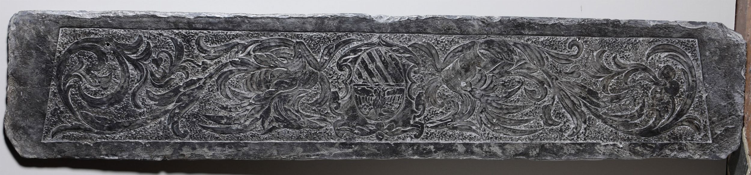 Frontone in ardesia raffigurante stemma nobiliare. Probabile XVII secolo